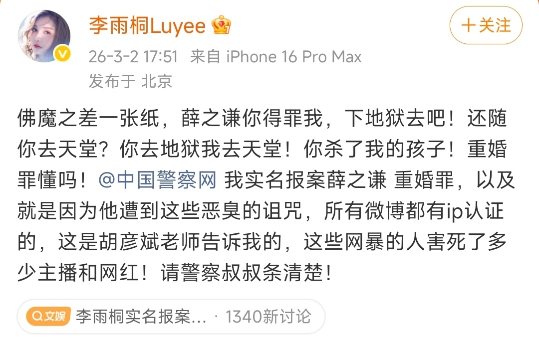 李雨桐实名报案薛之谦重婚罪 没实锤就空口泼脏水,李雨桐这是怎么了?莫名其妙跳出来实名报案薛之谦重婚罪,看得人一头雾水。嘴上喊得比谁都凶,又是重婚又是各种指控,长篇大论胡言乱语。