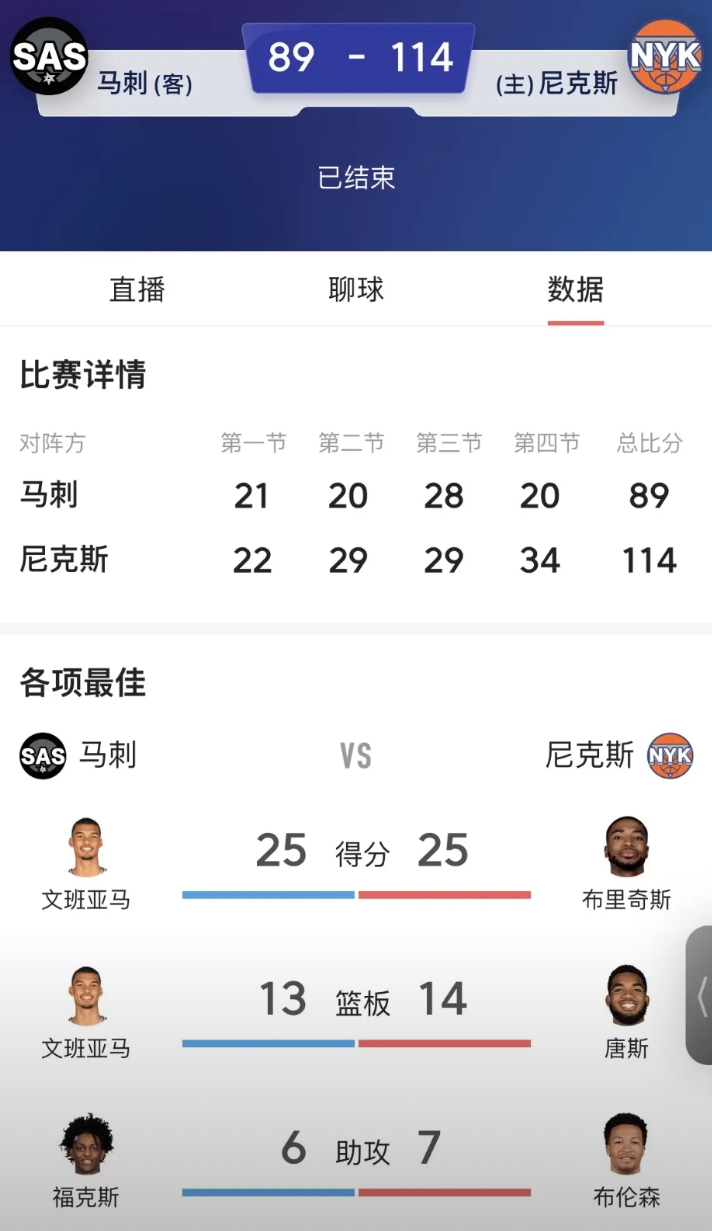 一物降一物,这世间一切都有相克。 马刺可以赢卫冕冠军雷霆四次,可以赢联盟第一活塞,却多次在尼克斯身上栽跟头, 在NBA杯决赛上输给了尼克斯后,今天又是89:114大比分输了比赛, 马刺:做梦都想打雷霆 雷霆:做梦都想打尼克斯 尼克斯:做梦都想马刺
