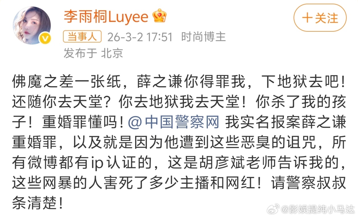 李雨桐实名报案薛之谦重婚罪不er~这姐是受啥刺激了?说要举报薛之谦重婚罪?然后等等,又关胡彦斌啥事啊 胡彦斌到底告诉你啥了