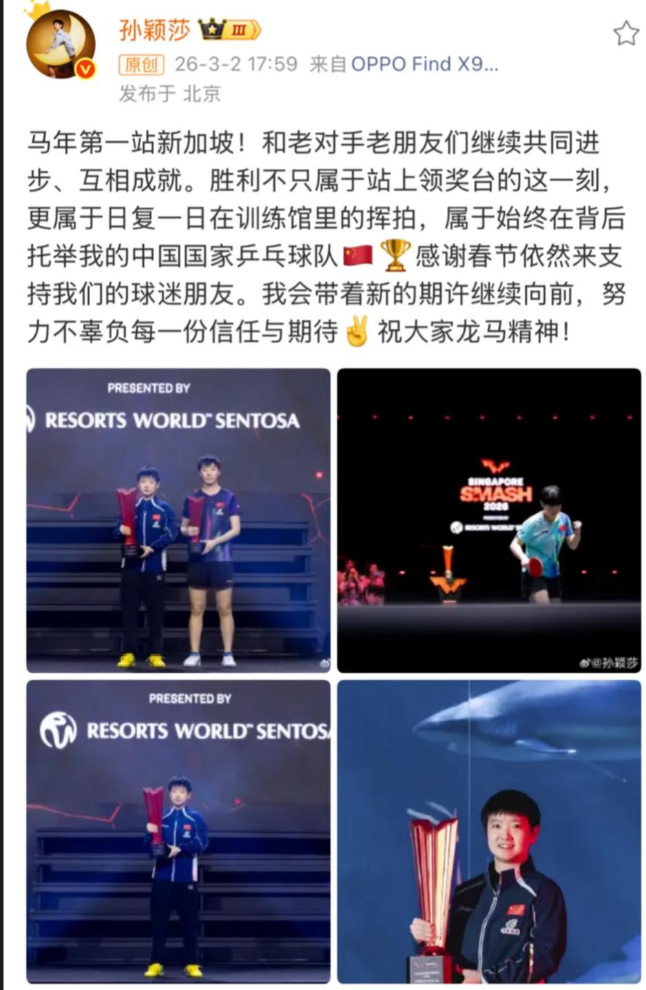 孙颖莎发文啦:马年第一站新加坡 和老对手,老朋友们继续共同进步, 互相成就, 胜利不止属于站在领奖台上这一刻, 更属于日复一日在训练馆挥拍, 属于始终在后面一直推举我们的 国家乒乓球队, 感谢支持我们的球迷, 我会带着大家的期许, 努力向前……. 老朋友说的是曼昱吧, 莎莎在采访中不止一次的说过 感谢曼昱,我们是队内良性竞争, 互相促进, 感谢有曼昱的存在, 才会让自己一直努力向上! 世界杯,伦敦百年世乒赛 即将到来, 国乒女队能靠谁守住上下半区, 只有莎莎和曼昱最值得信赖, 缺一不可, 2026,团结一致, 一致对外, 共同抵御外协最重要, 莎莎的言语中透露出团结一心 的目标!