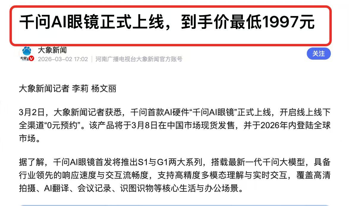 国内传来一条消息,事关中国科技,估计外媒又要酸了! 在3月2日的时候,阿里"千问"首款硬件产品"千问AI眼镜"正式上线并开启0元预约。值得一提的是,与此同时,千问AI眼镜还在巴塞罗那MWC世界移动通信大会迎来全球首秀。 为什么说外媒会酸呢?总结起来原因有两点。 第一:技术比海外Meta等AI眼镜含量高不说,产品价格还更便宜。 根据媒体等消息显示,千问AI眼镜首发推出S1与G1两大系列,不仅全面覆盖高清拍摄、AI翻译、会议记录、识图识物等一系列生活办公场景。关键是还会在3月底的时候,全面接入千问APP的办事能力,通过千问AI眼镜也能实现点外卖、订酒店,真正实现了“做实事儿,解难题”。 这些能力海外的AI眼镜不具备不说,关键是价格也没有千问AI眼镜的低,比如G1系列的AI眼镜,最低到手价才1997元,咱们普通配一副眼镜也要大几百上千,而集合了新科技,能办事的千问AI眼镜也就这个价,性价比这方面也直接碾压海外的产品了。 第二:千问AI眼镜的目标明确,指向的是海外市场。 千问AI眼镜将会在2026年内全面进军海外市场,并且它还会和Spotify、PayPal、Google Maps等主流国际生态服务进行深度适配。 这也就意味着,千问AI眼镜的生态适配能力极强,可以驾驭多个不同的生活场景,随着千问AI眼镜的市场份额不断扩大,到时候世界上使用中国科技产品的人会越来越多,中国科技很有可能成为世界的主流。 只能说千问的技术能力还是太全面了,刚刚过了年就带给大家这么多惊喜,不敢想接下来的日子将会有多精彩!