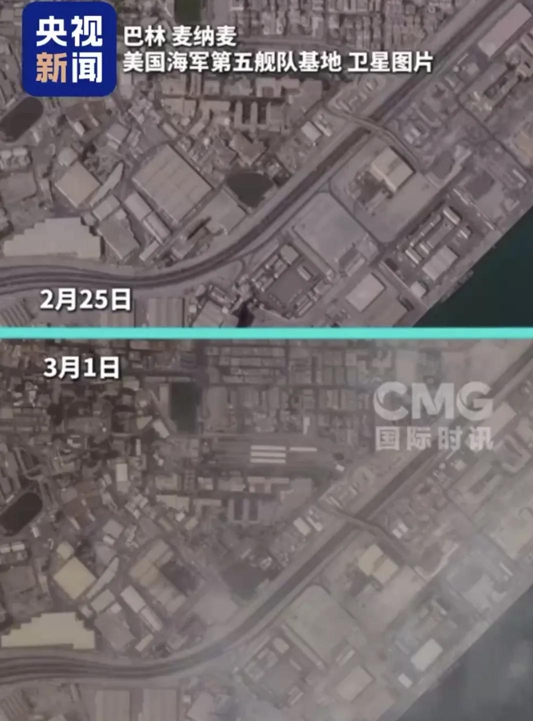 央视放出对比图,巴林的美海军第五舰队总部被炸前后对比 拦不住,美国也拦不住伊朗。 3月2日,央视新闻客户端放出了巴林的美海军第五舰队总部被伊朗导弹袭击前后对比图。 是的,打中了,一个外观类似厂房一样的房子,从顶部被洞穿炸毁约三分之一,考虑到爆炸的飞溅物和冲击波,里面大概率全完了。 伊朗2月28日至3月1日连续两天打了这里,部分导弹肯定被美方拦截了,但美方拦不住所有,被击中了。说明伊朗导弹对美军也拥有确确实实的威慑力。 1天过去了,具体人员伤亡和设施装备毁损程度仍没有公布,想必不会小,否则不必遮遮掩掩。而3月1日晚,伊朗方面称,其反击行动已造成560名美军伤亡。巴林有多少? 此前为应对伊朗可能的打击,美国已提前缩减巴林基地人员,据说只留下关键人员。另据美媒报道,至今年2月底,该基地剩下不足100人。 所以,你说,巴林基地美军到底伤亡多少? (来自央视新闻客户端)