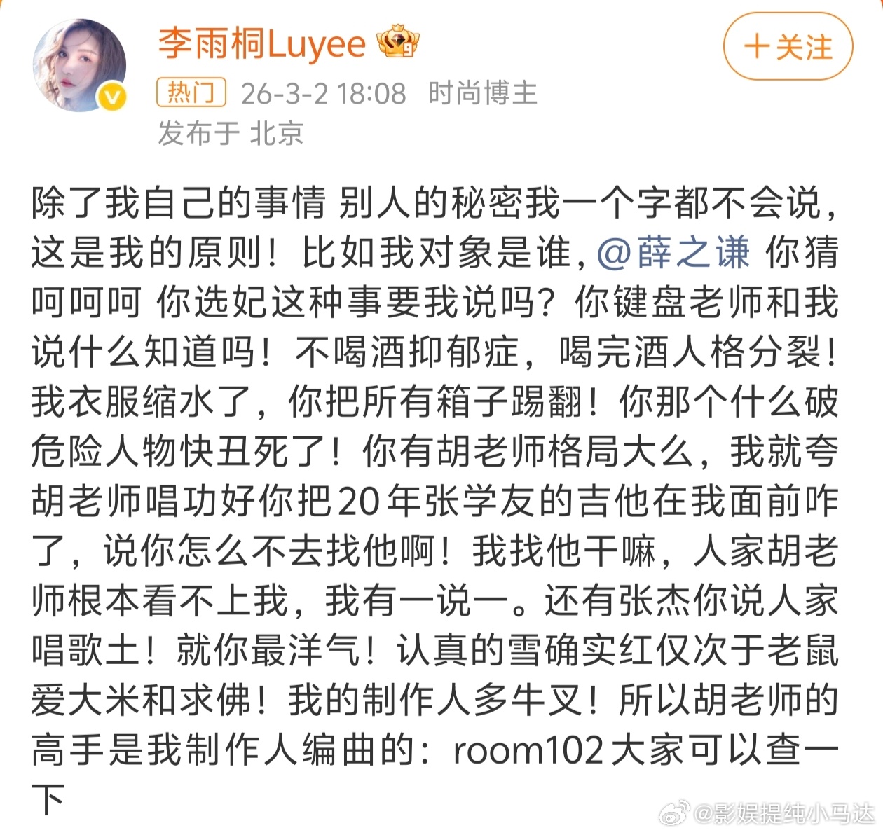 薛之谦 选妃我靠,除了带上胡彦斌,李雨桐又把张杰带上了李雨桐称薛之谦说张杰唱歌土这姐为啥就是说说说不放料呢没啥聊天截图依据啊?仅凭一张嘴嘛