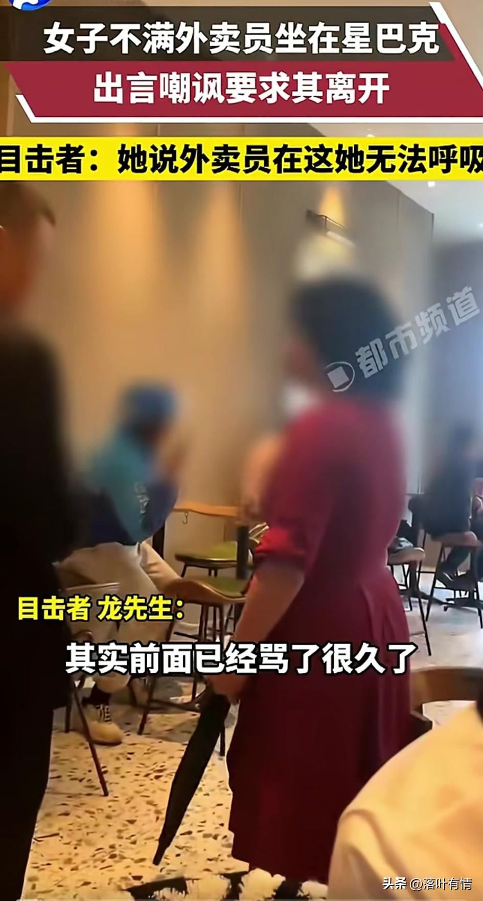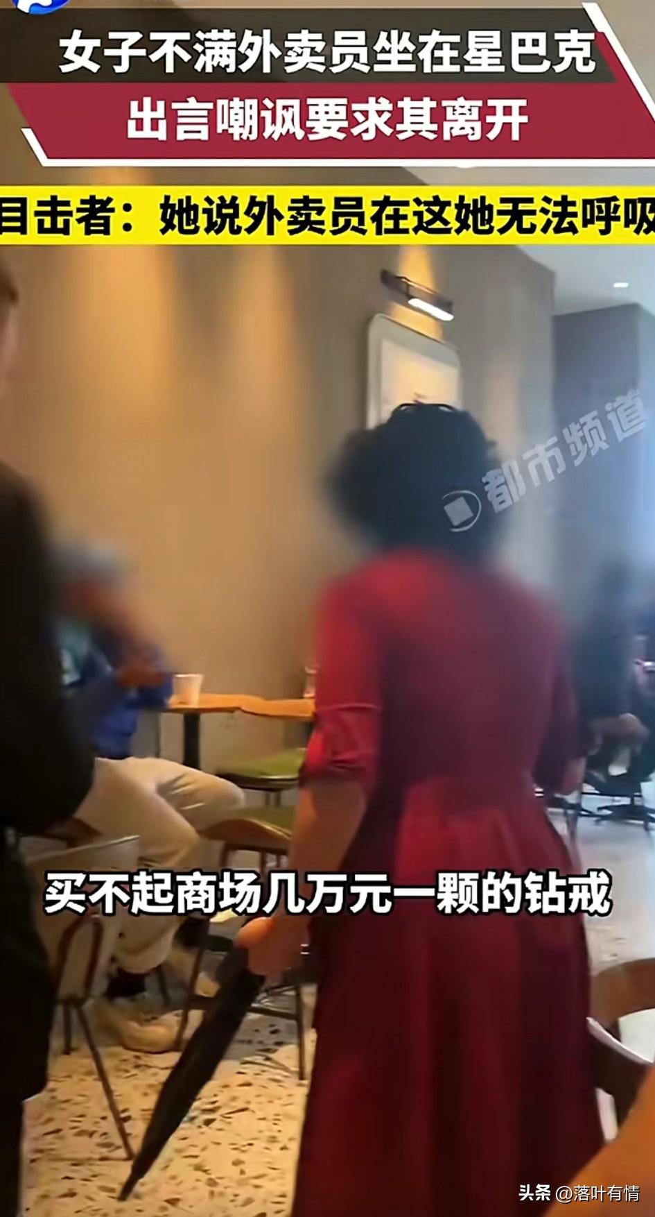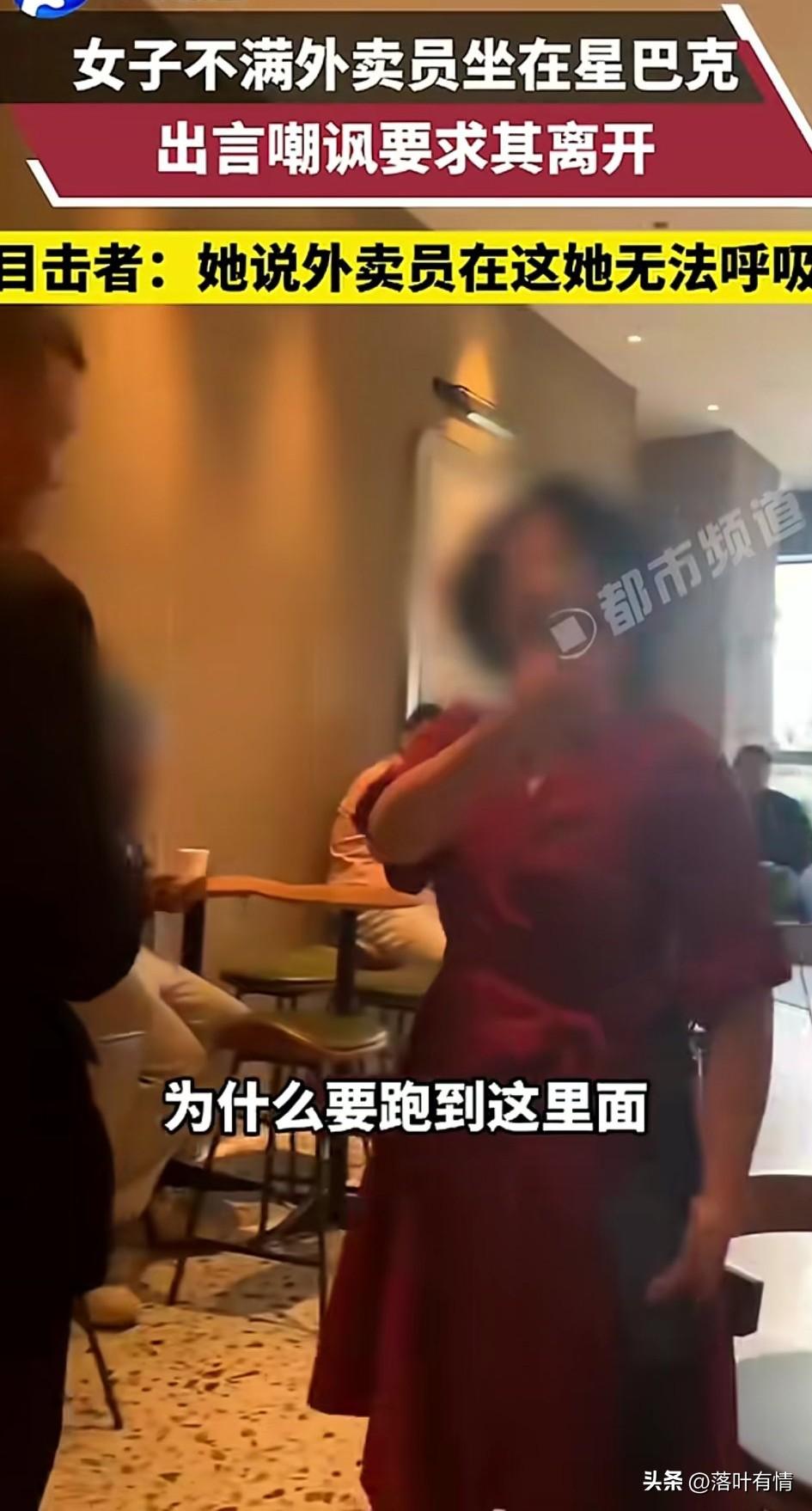 四川这女人真的让人无语, 外卖员累了坐在星巴克休息, 没想到这引起了一位大妈都不满, 大妈对着外卖员说了非常难听的话, 驱赶对方离开, 还找来工作人员驱赶, 看着让人非常的生气, 周围的人都对这位大妈做法表示反对, 大妈却依旧不依不饶, 表示外卖员坐在这里污染了空气, 让她呼吸都不顺畅了, 还表示自己只想在这里悠闲的喝一杯咖啡,外卖员坐在这里影响自己的心情, 工作人员表示谁都可以坐这里, 这把大妈气的不行, 大妈觉得自己喝了杯星巴克, 自己就是人上人了, 还嘲笑外卖员买不起商场几万块钱的一颗钻戒,殊不知外卖员有些真的很有钱,这种大妈真的是没有素质! 大家见过这样的大妈吗?
