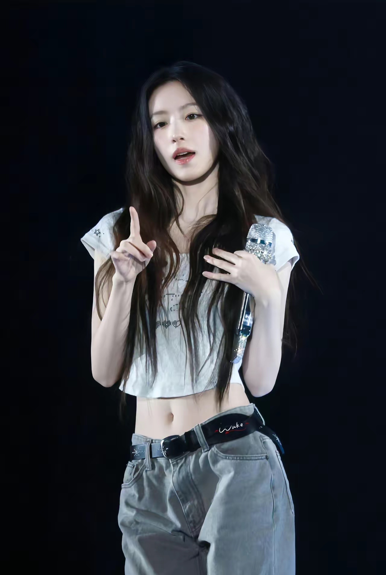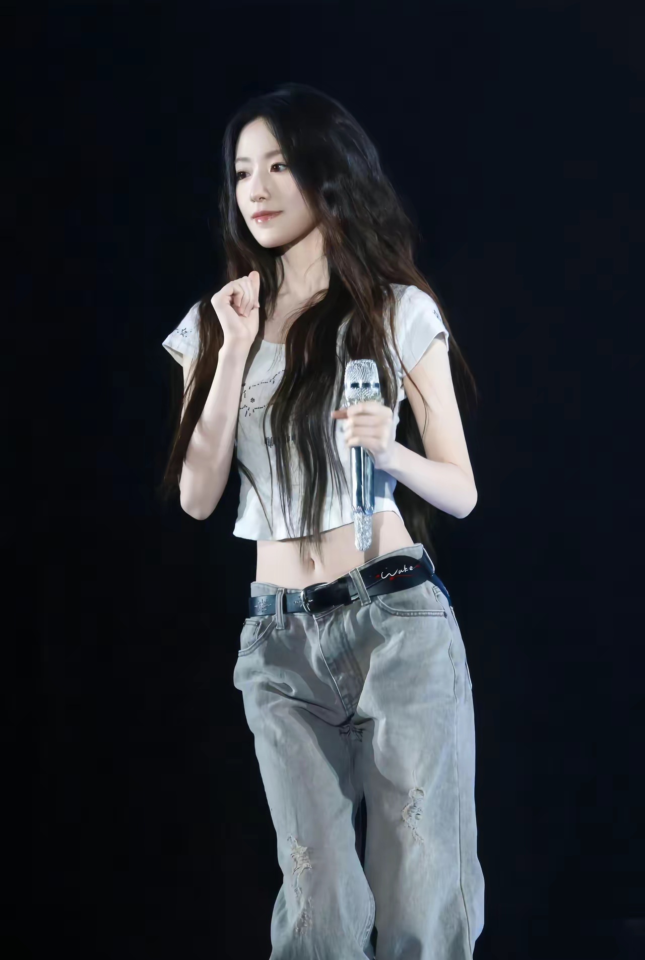 刘亦菲这条裤子挺养生,毕竟降温了肚脐眼必须护住啊