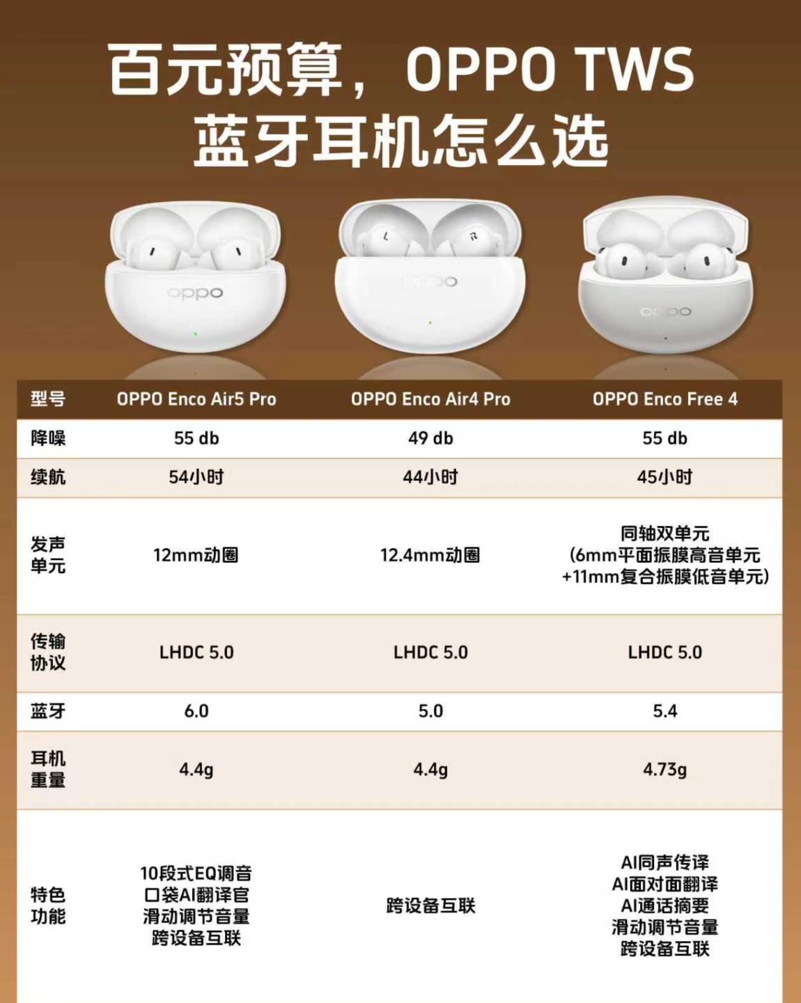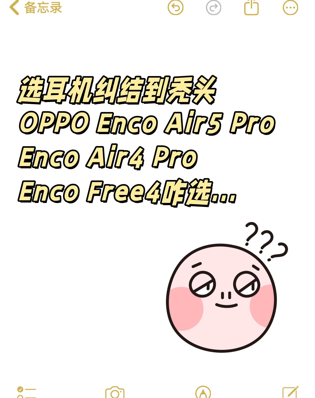 OPPO Enco三款耳机怎么选?越看越懵🤯 谁懂啊!选耳机纠结到秃头😩 看中了OPPO家的耳机,就是不知道Enco Air5 Pro、Air4 Pro、Free4咋选... 翻遍测评还是懵,感觉好多人都没分清定位 我自己扒了半天整理清楚,分享给同款选择困难的宝👇 先划重点⚠️Free系列定位比Air系列更高端 整体配置、体验也更顶,所以怎么选要看你要啥 ✅新晋全能王OPPO Enco Air5 Pro Air系列新款,性价比很高 起步价💰329,到手才279 支持55dB降噪+54h长续航 日常听歌、宿舍自习、通勤完全够 蓝牙6.0稳得很,学生党、通勤族闭眼入 ✅旗舰体验OPPO Enco Free4 属于中高端旗舰,活动价449💰补贴后404 支持丹拿调音+双单元,音质拉满 还有自适应降噪,适合追求质感、预算充足的通勤/办公党 ✅均衡选手OPPO Enco Air4 Pro Air系列老款,49dB降噪+44小时续航,12.4mm镀钛振膜 基础降噪续航够用,该有的都有 活动价205💰补贴后174 适合预算有限但想要Pro级体验的日常用户 综合售价和定位,按需求选就对了! 清楚定位真的不纠结,希望帮到和我一样迷茫的姐妹~ 蓝牙耳机选择困难症OPPO Enco Air5 Pro