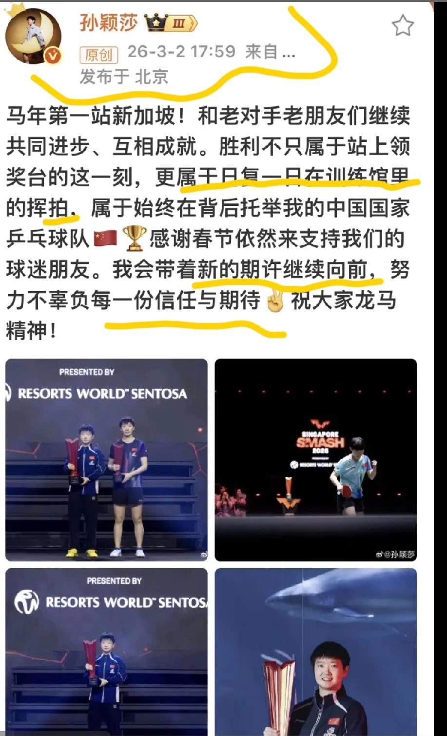 莎莎发小作文啦!我们莎莎真的是很宠她的球迷们,知道大家想看到她,想知道关于她的事情,她在围脖🧣发了小作文,她首先感谢了队友和对手,有了强大的对手才督促自己不断进步;她说胜利不止属于领奖台那一刻,更是属于无数次的挥拍训练;她感谢国家的培养和托举,并感谢球迷们的热爱和支持;她展望未来,说:会带着新的期许继续向前,努力不辜负每一份信任与期待;最后莎莎㊗️大家龙马精神 莎莎好好休息, 和家人共度元宵佳节[比心][比心][比心] 记录我的2026 乒乓球