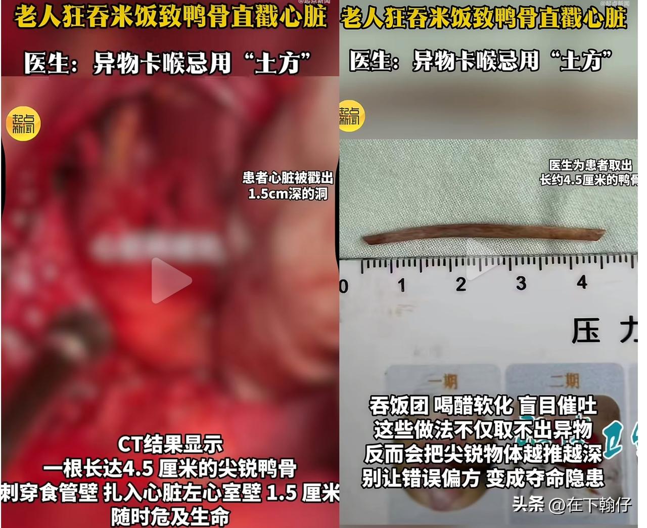 “土方法”又惹祸!鸭骨卡喉狂塞米饭,食道被刺穿直抵心脏,这起悲剧给所有人敲响警钟! 福建一位七旬奶奶误吞鸭骨,信了吞饭团能压下去,狂塞米饭,结果4.5厘米的鸭骨直接刺穿食道,扎进心脏1.5厘米,差点当场没了。手术捡回一条命,医生都看傻了。 我记得我们小时候卡了鱼刺也是说吞米饭或者喝醋[捂脸] 1. 吞饭团、塞馒头(最危险!): · 原理分析: 企图用大的食物将骨头强行“推”下去。 · 致命后果: 这就像“打桩”。尖锐的异物(如鱼刺、鸭骨)在压力的作用下,不仅可能卡得更深,更容易刺穿食道壁。食道旁边就是主动脉、气管和心脏,一旦刺破主动脉,几分钟内就会大出血死亡,连抢救的机会都没有。福建奶奶就是最典型的例子。 2. 喝醋: · 原理分析: 认为醋能软化骨头。 · 致命后果: 纯属心理安慰。醋在食道里只能短暂停留,对骨头的软化作用微乎其微。相反,高浓度的醋会灼伤已经被骨头划伤的食道黏膜,引起剧痛,并加重炎症和水肿。 3. 手抠催吐: · 原理分析: 试图用手指把异物抠出来。 · 致命后果: 手指伸入喉咙会刺激产生咽反射,导致肌肉剧烈收缩。这种收缩和挤压,同样可能使本来位置尚浅的骨头越扎越深,甚至断裂,增加取出难度。 别再信吞饭、喝醋、手抠了!全都没有科学依据,正确的做法只有一个,无论是鱼刺、鸡骨还是鸭骨,卡住后第一时间停止一切进食和饮水,立即前往最近的医院(挂耳鼻喉科或急诊科)。医生取出的几分钟能解决的事,整个过程创伤小,恢复快。千万不要因为“图省事”或“迷信土法”。 请把这篇文章转发到“相亲相爱一家人”的家族群,转告家里的长辈和孩子。