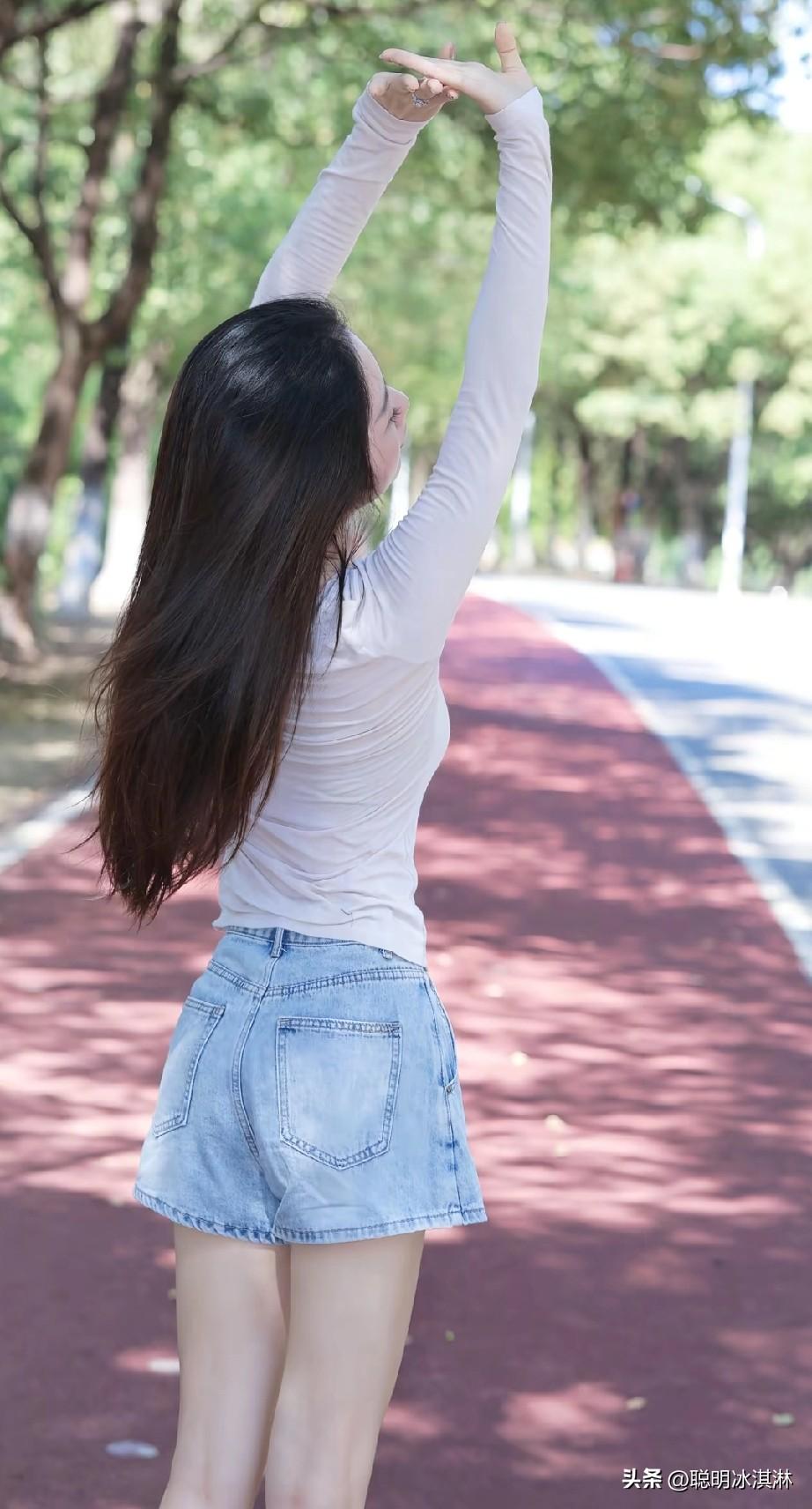 阳光下的清新少女,漫步在绿树成荫的小路上。
