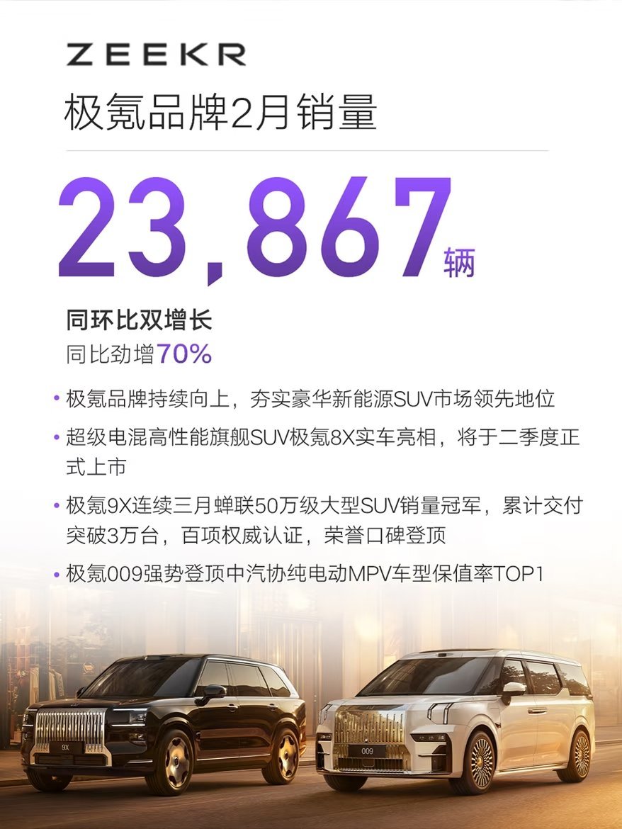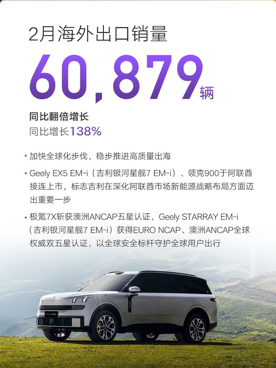 吉利晒出的2月销量成绩单很亮眼啊,1-2月累计销量突破47.6万辆,连续两个月霸榜中国自主品牌销量第一。其中新能源占比高达57%,极氪单月劲增70%。关键他这个成绩不仅仅是在国内卷出来的,2月海外出口超6万辆,同比暴增138%。