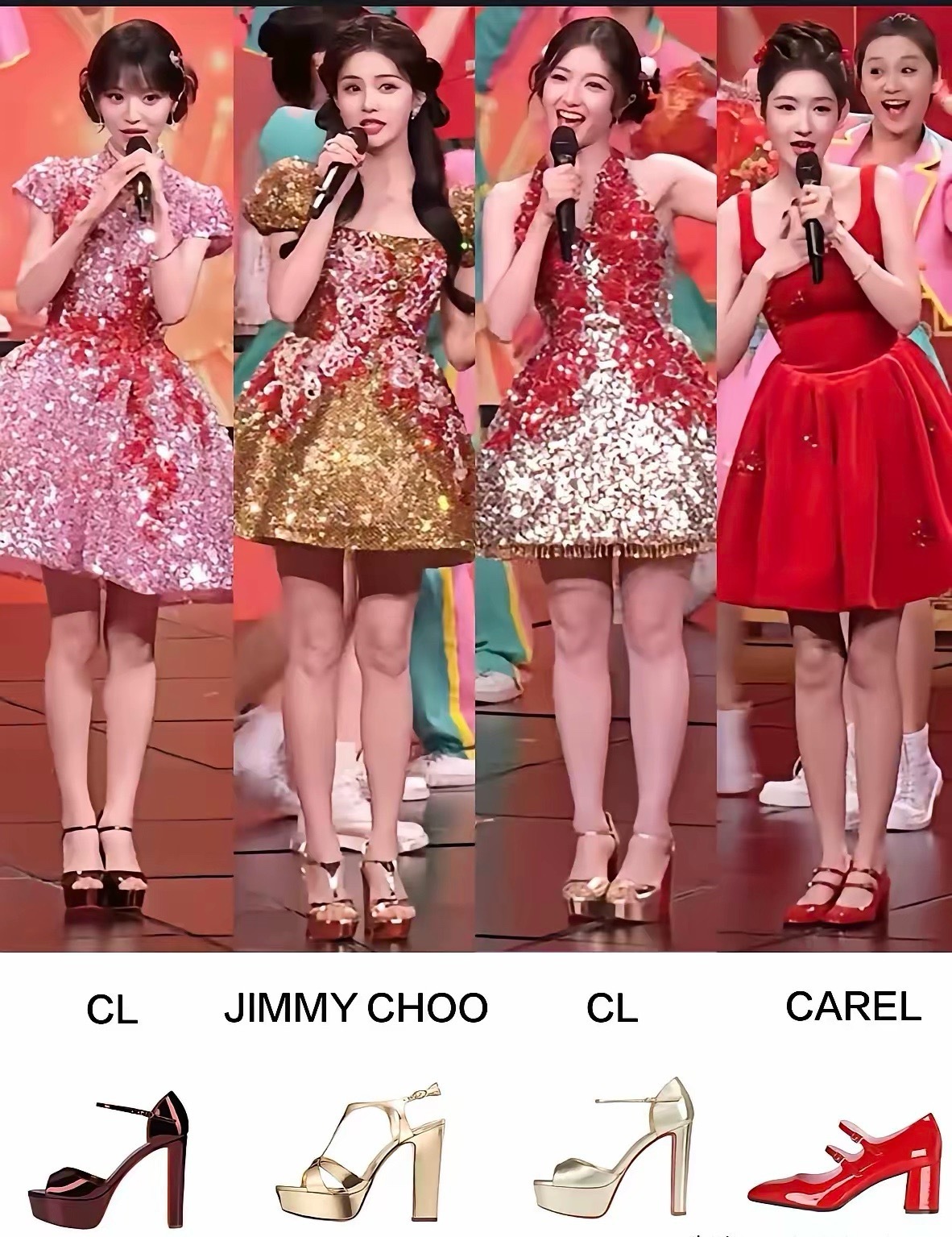 这四位是演员王玉雯。图片展示了她在不同场合的四个造型,从左到右分别是:身穿CL品牌粉色亮片裙、Jimmy Choo品牌金色礼服、CL品牌红银渐变亮片裙,以及Carel品牌红色连衣裙的造型。