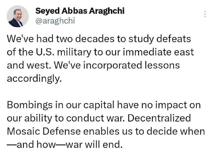 伊朗外长发文喊话美国和以色列!现在你们打算怎么做? 美伊冲突第一天!伊朗多位重要人物被灭掉,可是并不代表美和以色列就胜利了。 在美伊冲突第三天,伊朗发射了“霍拉姆沙赫尔-4”超音速导弹,也许这样的导弹不能被拦截,结果以色列总理的办公室和空军司令部,“造成严重破坏”,除此之外,还有以色列南部城市贝尔谢巴也升起了浓烟,这也是以色列遭受最严厉的打击,也能看出伊朗也能对以色列精准打击了。 随后,伊朗外长还发文喊话美国和以色列。 大概意思就是,虽然美国和以色列把哈梅内伊给除掉了,可是没有关系,对接下来的战争并没有任何影响,另外美国和以色列接下来也不知道谁在指挥了,就算是新的指挥官被击毙,还会有新的继续顶上,也就是告诉美国他们是打不完的。 所以伊朗外长最后告诉美国和以色列说:美国和以色列,现在你们打算怎么做?从最后一句话可以看出伊朗外长似乎在藐视美国和以色列。 当然了要是按照以色列外长的话,美国和以色列还真没有办法对付,估计这次美国和以色列算是摊上大事了,甩都甩不掉了,就像伊朗外长之前说的那样,什么时候结束战争是伊朗说了算。