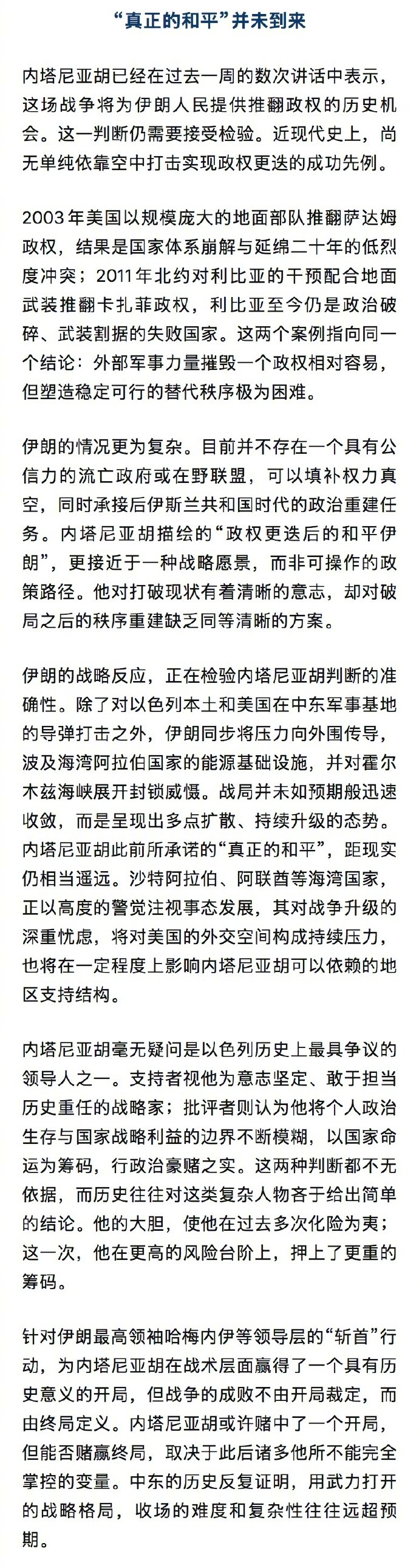 在这一背景下,内塔尼亚胡选择继续对伊朗最高领袖哈梅内伊等领导层展开“斩首”行动,究竟是一个经过深度战略测算的历史性决断,还是一个夹杂着个人政治算计的冒险之举,答案可能兼而有之。内塔尼亚胡押上的,不仅是以色列当下的国家安全,更是他数十年从政所积累的全部政治生涯。这场战争若能朝着他所期望的方向演变,他将以“终结伊朗威胁”的历史功勋被载入史册;若方向相悖,他将作为将以色列带入一场代价难以估量的战争的领导人,承受历史的最终裁判。