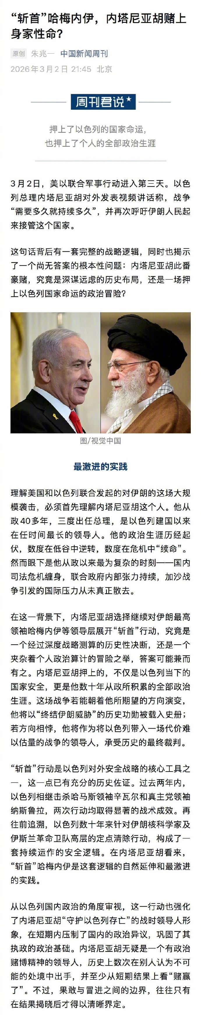 【中国新闻周刊:#内塔尼亚胡为何誓要斩首哈梅内伊#】#哈梅内伊妻子伤重不治去世# 3月2日,美以联合军事行动进入第三天。以色列总理内塔尼亚胡对外发表视频讲话称,战争“需要多久就持续多久”,并再次呼吁伊朗人民起来接管这个国家。