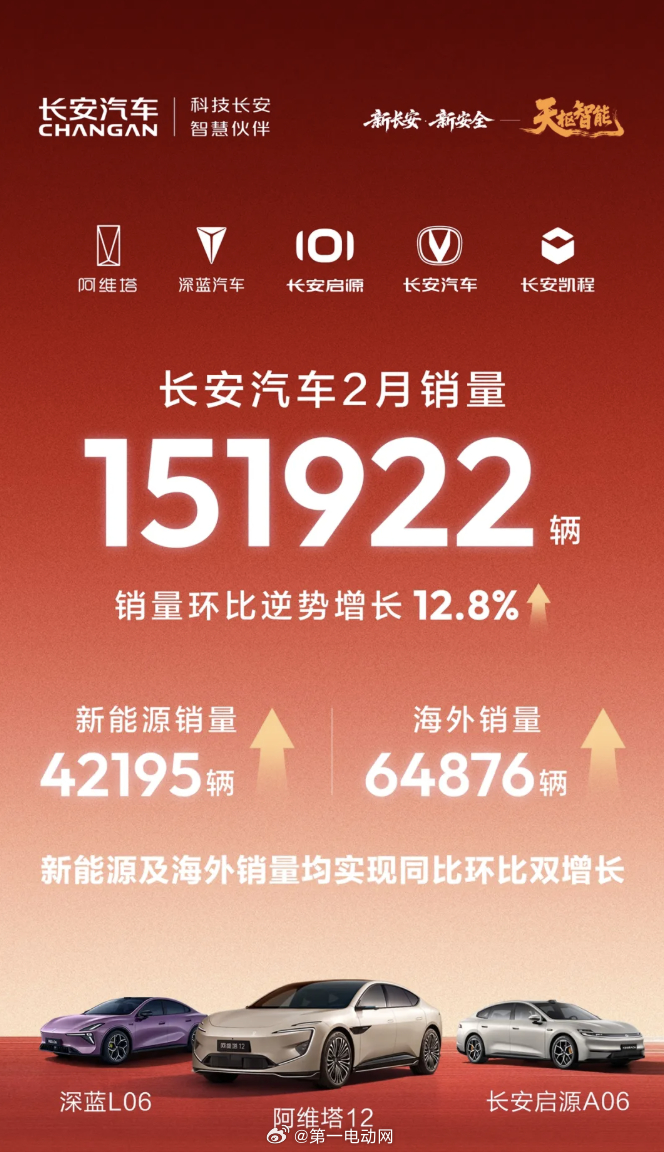 新能源领域,长安汽车2月销量达到42195辆,海外销量则为64876辆