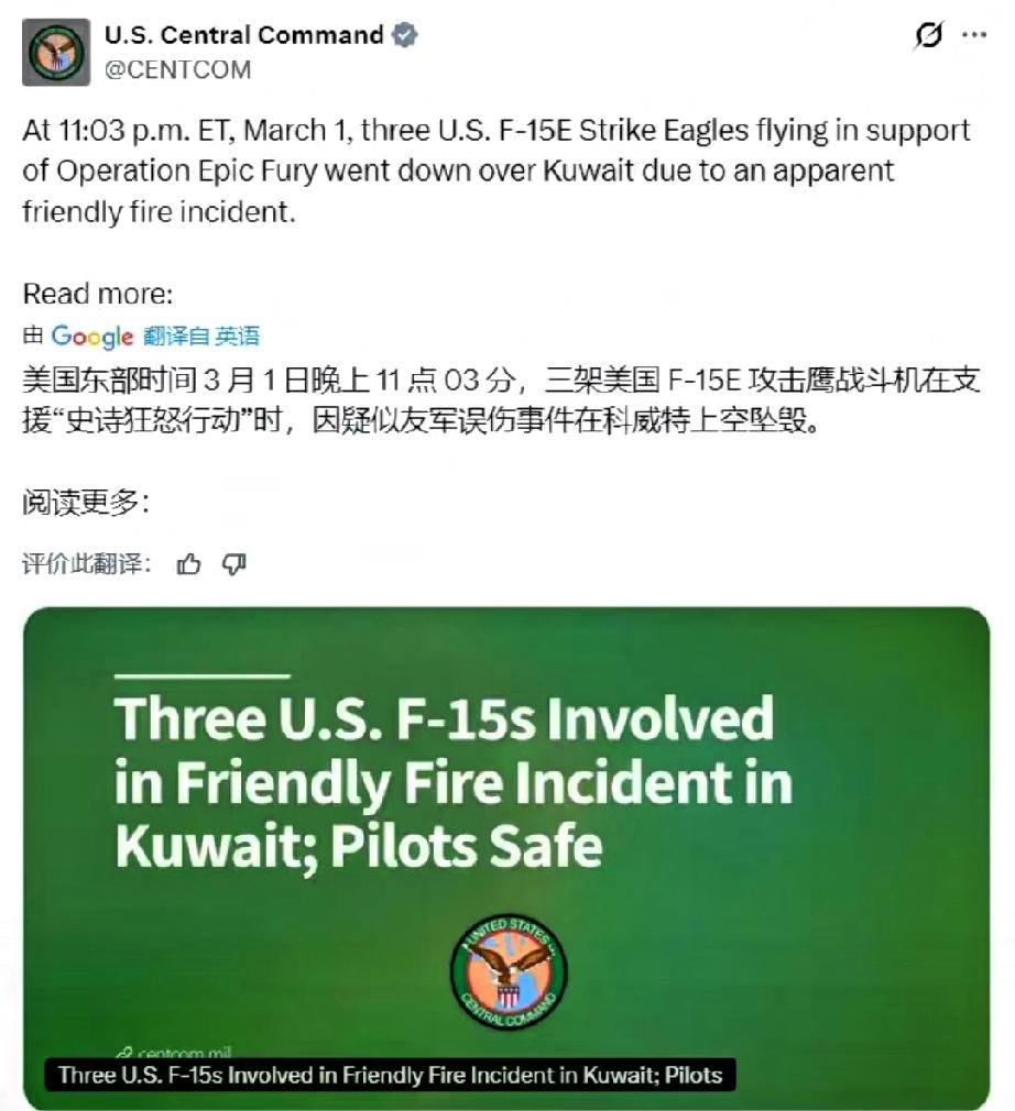 快讯!美国中央司令部刚刚发帖证实:美国东部时间 3 月 1 日晚上 11 点 03 分,三架美国 F-15E 战斗机在支援“史诗狂怒行动”时,因疑似友军误伤事件在科威特上空坠毁。 美国中央司令部在事发后发布完整声明,明确三架F-15E战机是被科威特防空系统误击坠毁,并非遭遇外部敌方火力打击,事件性质已经清晰确定。 机上共计六名机组人员全部成功弹射逃生,落地后被快速搜救力量安全转移,目前所有人员均在医疗机构接受检查,身体状态保持稳定,无生命危险。 科威特国防部第一时间公开发声,承认此次误击事件由己方防空操作失误导致,向美方表达歉意,并承诺全程配合开展事故原因调查工作。 事发时该空域处于高强度交战状态,同时出现大量军机、无人机与弹道导弹,空中目标数量多、识别难度大,现场环境极度复杂混乱。 F-15E是美军主力重型多用途战机,单架造价约7000万至8000万美元,三架战机损毁带来的直接装备损失,总金额超过2亿美元。 美科双方迅速组建联合调查小组,进驻事发区域开展工作,重点核查敌我识别系统兼容性、空地通讯链路与指挥协同流程。 调查团队将先完成现场残骸收集、机组人员问询等基础工作,再对相关装备系统进行全面技术检测,整体调查周期尚未对外公布。 现代战场的复杂电磁环境会干扰雷达信号,影响敌我识别系统的正常工作,这也是此次友军误击事件出现的重要客观诱因。 美科两国保持长期军事同盟关系,常年开展联合军演,此次事故直接暴露多国联合作战场景下,指挥与协同环节存在明显漏洞。 伊朗方面对外宣称击落这三架美军战机,该说法与美科双方的官方声明完全矛盾,目前伊朗未提供可证实该说法的实质证据。 事发后美科双方立即调整事发空域的管控流程,增加目标识别核对环节,强化空地信息同步,降低再次出现误判的可能性。 这是美军近期在中东地区遭遇的罕见重大装备损失,对前线作战部队的士气造成直接影响,也引发外界对美军作战体系的重新审视。 友军误伤在现代联合作战中并非个例,单一装备先进无法弥补体系短板,跨军种、跨国家的无缝协同,才是安全作战的核心保障。 各位读者你们怎么看?欢迎在评论区讨论。