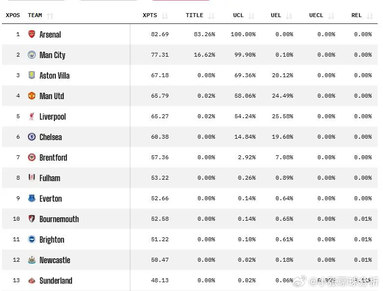 除了阿森纳和曼城,维拉(0.08%)、曼联(0.02%)、利物浦(0.02%)也有一定的夺冠概率,但都可以忽略不计。此外,剩余的15支球队夺冠概率均为0%。