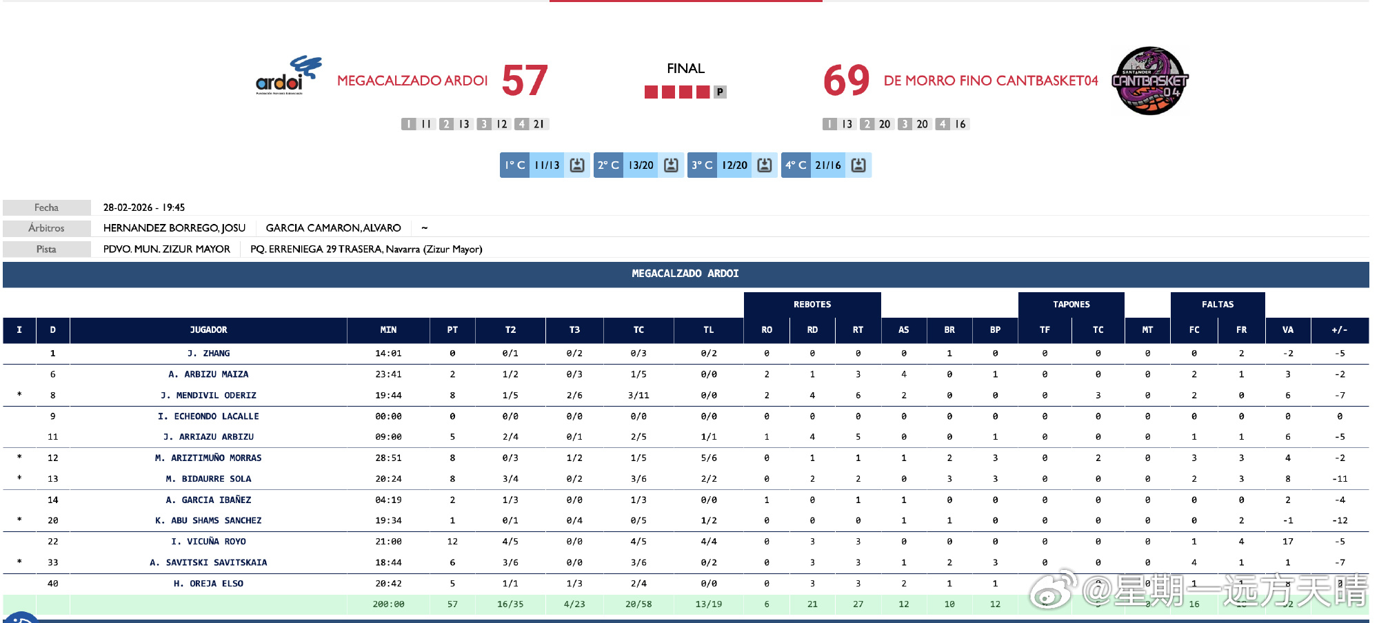 辽宁男篮辽篮张峻豪西班牙联赛 小豪本周出场14分钟,得到1抢断,正负值-5 。球队57:69输掉了比赛。
