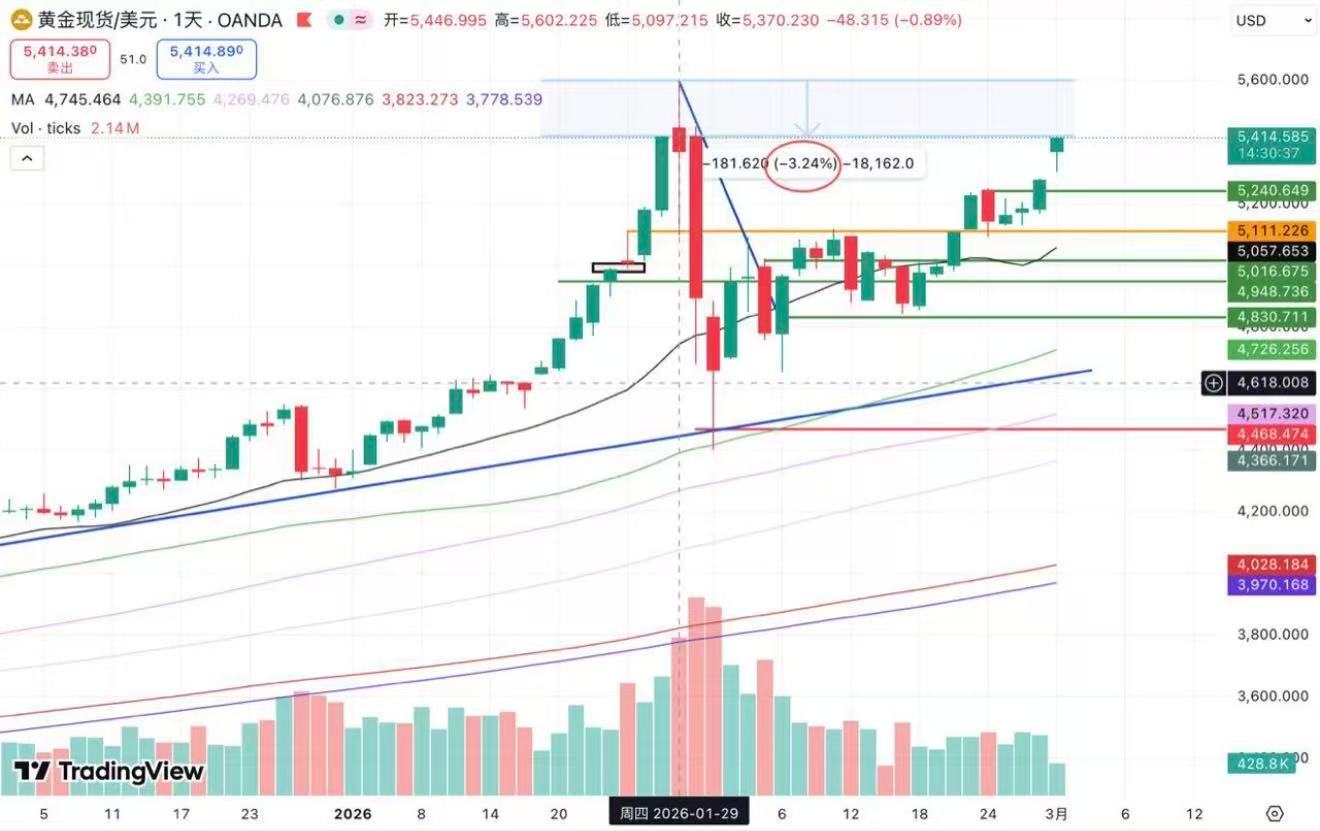 黄金价格距离历史高点 5602 美元/盎司 仅剩 3.2% 的空间。一旦完成突破,意味着压制多头已久的天花板被正式掀开,市场将进入全新的价格发现阶段。
