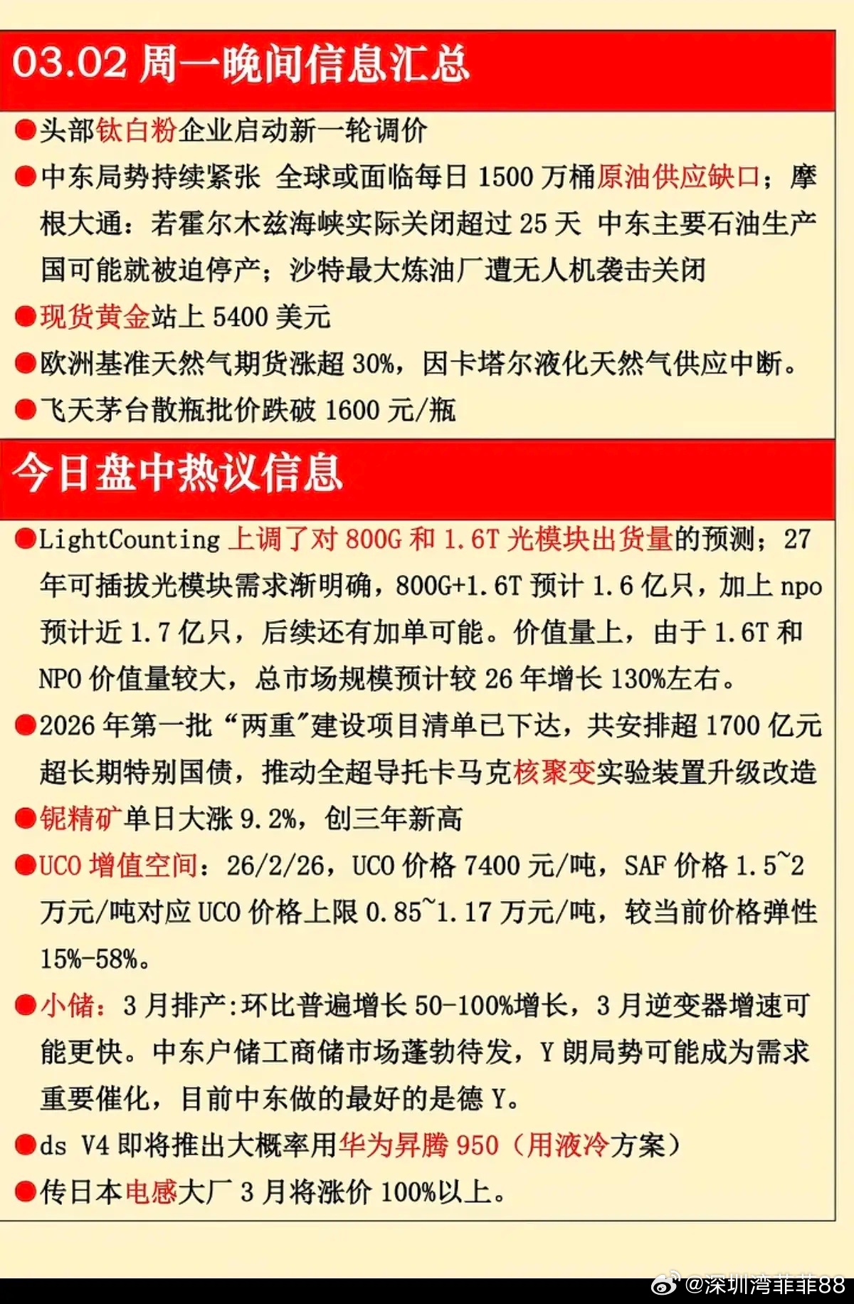 1.钛白粉,新一轮涨价2.原油供应缺口3.白酒,批发价4.光模块5.铌矿涨价6.华为昇腾