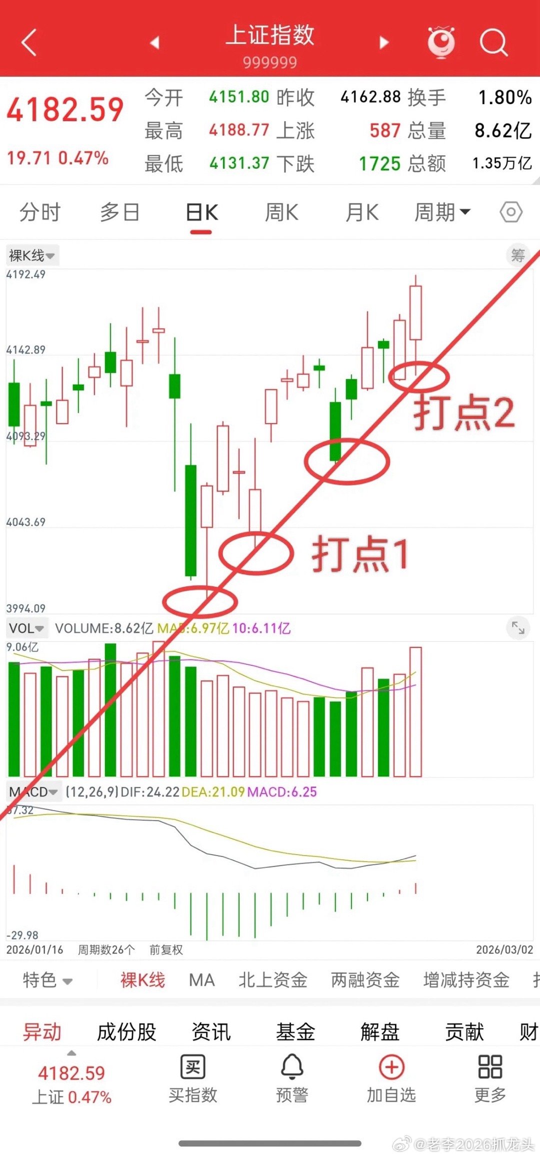 先说观点,大盘目前走势良好,没有什么问题,从周K线来看,大盘上周突破4190-4170下降趋势压力,今天最低点是4131,正好完成突破后的回踩,回踩不破支撑,然后继续上攻。