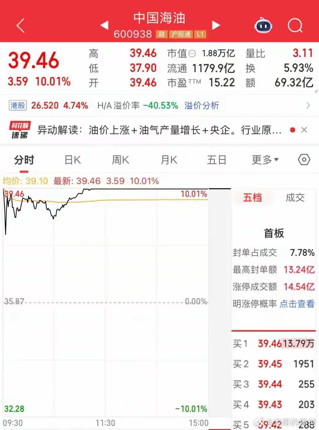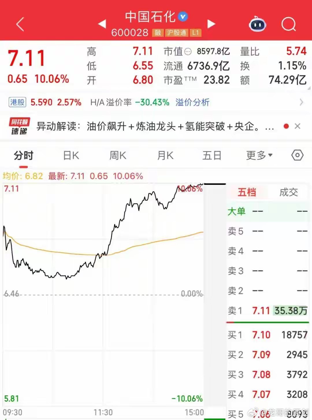 三桶油历史首次集体涨停!A股3万亿量能走出极致结构行情今天A股太有辨识度了!三桶油史无前例集体涨停,中石油、中海油封板,中石化尾盘竞价也涨停,这画面真没见过🤯大盘低开翻红,沪指微涨0.47%,但超4200只个股下跌,3.05万亿成交额全扎堆在避险和资源线:油气、黄金掀涨停潮,军工、煤炭、化工跟涨,反观AI、半导体、消费全调整,二八分化拉满。现货黄金也突破5400美元大涨,地缘局势驱动下,资金疯狂抱团资源避险,这行情真的是轻指数、重结构到极致。短期跟着资金主线走准没错,避险板块热度还在,题材则得等轮动修复了~A股 三桶油 黄金 股市行情