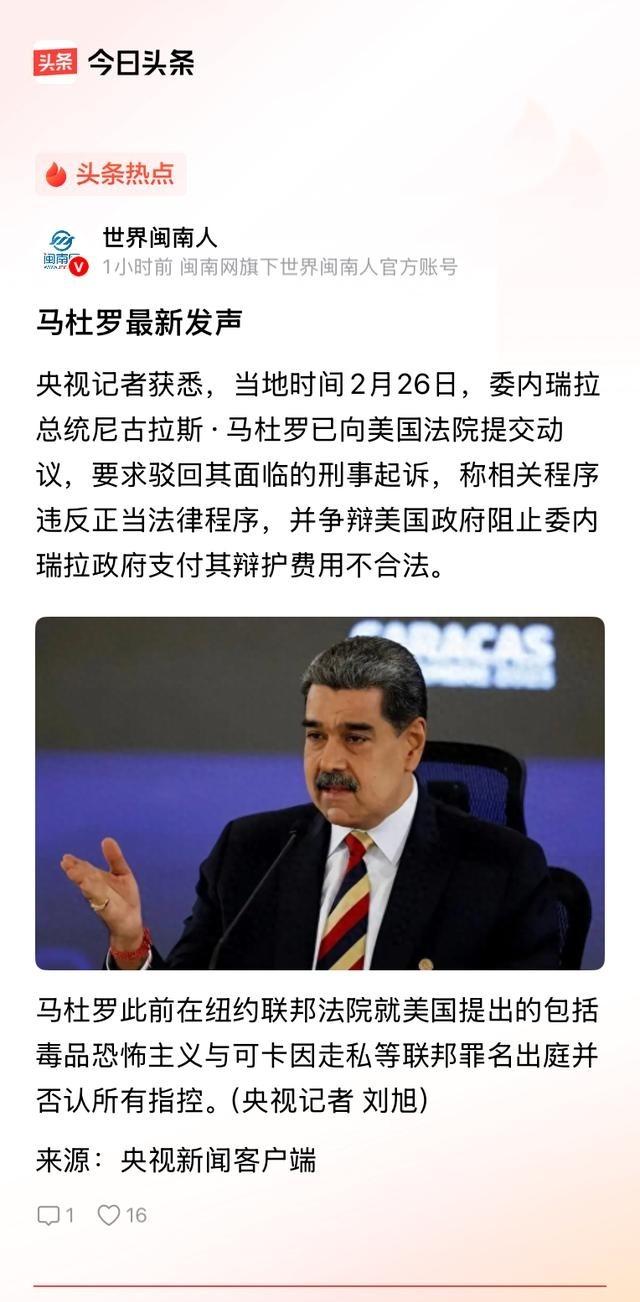 委内瑞拉人民尊敬的总统马杜罗先生被美国抓捕已经一月有余,除刚开始各种集会抗议美国霸权行为要求释放总统消息纷纷扬扬、各友好国家各种声援声明接连不断,不久就偃旗息鼓了。一个多月后,就这么落落寡欢地出来这么一条不痛不痒的可怜巴巴的消息刷了一下存在感。 2026年1月3日美国特种部队在加拉加斯行动,把马杜罗和他妻子西莉亚·弗洛雷斯抓了。美方说是根据贩毒恐怖主义、可卡因输入美国等多项指控执行逮捕。抓捕后直接把他俩弄到海军舰上,再转到纽约。1月4日美国司法部更新起诉书,1月5日马杜罗在曼哈顿联邦法院出庭,戴着翻译设备,否认所有罪名。现在他和妻子关在布鲁克林大都会拘留中心,等着审判走程序。 这件事一出,委内瑞拉国内马上有反应。加拉加斯和其他城市有支持者上街,举标语喊口号,说美国侵犯主权、绑架总统。一些拉美国家、俄罗斯、中国发了声明,支持委内瑞拉捍卫主权,反对外部干涉。副总统德尔西·罗德里格斯接手当代理总统,刚开始在电视上讲话,要求美国放人,还说这是对国家尊严的挑衅。马杜罗的儿子尼古拉斯·埃内斯托·马杜罗·格拉也在网上发帖、发视频,号召大家团结抗议。那几天消息满天飞,社交媒体上全是相关内容,集会、抗议、声援声明连成一片,看起来声势挺大。 2月底马杜罗的律师在美国法庭递了文件,说美国挡着委内瑞拉用钱付律师费,要求驳回起诉,但法院没马上回应,案子还在走流程。到现在已经一个多月,马杜罗还在拘留所里关着,审判日期没定,委内瑞拉国内基本没再闹出大动静。 这事让人觉得挺讽刺的。刚开始声势浩大,好像全世界都要为马杜罗出头,结果一个月过去,声音就这么小了。可能是现实太硬,国内经济本来就烂,石油卖不出去,美元短缺,政府得先稳住自己。国际上各国也有自己的算盘,美国制裁继续,俄罗斯和中国忙着别的事,不可能为一个人无限投入精力。委内瑞拉内部派系本来就复杂,马杜罗不在,权力真空谁都想填,代理团队可能觉得低调处理更实际。老百姓日子苦,抗议几次没结果也就散了。 马杜罗这人执政这些年,经济搞成这样,移民潮几百万人跑出去,通胀一度上百万个百分点,很多人早就不满,只是之前靠控制军队和资源硬压着。现在他被抓了,国内支持者少了,国际盟友也冷了。事情发展到这步,感觉就是被慢慢晾在那儿,一条不咸不淡的消息出来刷个存在感,然后又沉下去。政治这东西,说到底看利益,情谊和口号到关键时候往往靠不住。