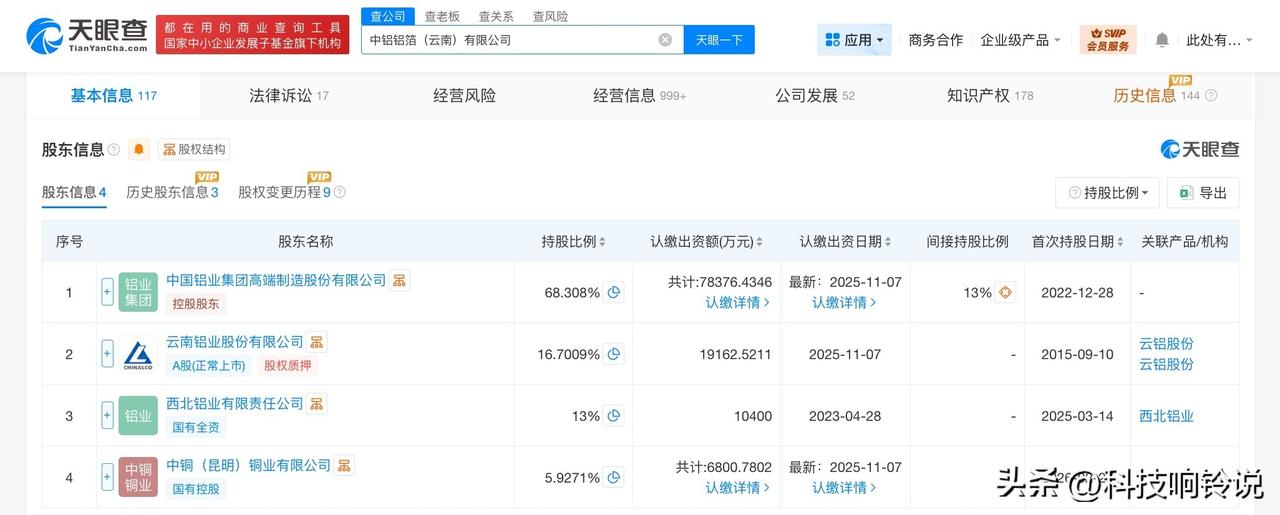 【中国铝业旗下云南铝箔公司增资至11.5亿 增幅约44%】 天眼查工商信息显示,近日,中铝铝箔(云南)有限公司发生工商变更,注册资本由8亿人民币增至约11.5亿人民币,增幅约44%。 该公司成立于1996年3月,法定代表人为徐涛,经营范围为铝铸轧卷、铝板带、铝箔产品及食品药品包装、电子电力用铝箔的生产、销售,对外贸易等。股东信息显示,该公司由中国铝业集团高端制造股份有限公司、西北铝业有限责任公司等共同持股。 天眼查信息: