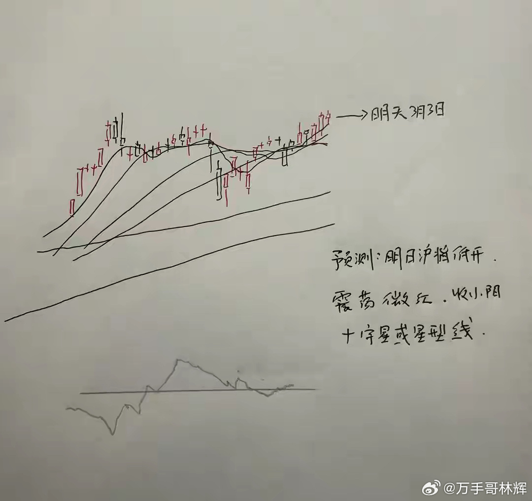 所以,综合以上分析,对于明天市场走势,我个人的观点是,明天上证指数或者还能够走出短线微幅上涨的小阳星走势。那么明天A股到底怎么走?大家请看关于明天走势的手绘预测图: