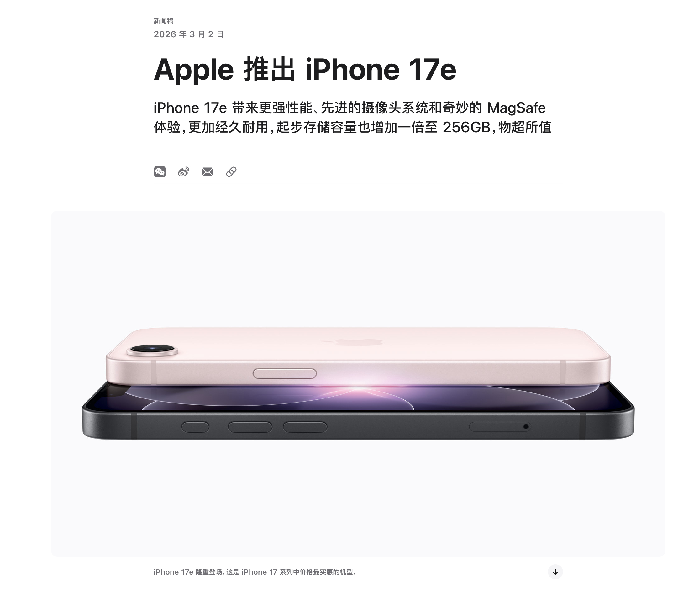 作为 iPhone 17 系列最实惠机型,它搭载 A19 芯片和全新 C1X 调制解调器,性能比 iPhone 16e 提升 2 倍。4800 万像素融合式摄像头支持 2 倍光学长焦和 4K 杜比视界视频,还首次加入 MagSafe 无线充电。6.1 英寸超瓷晶面板 2 抗刮划能力提升 3 倍,IP68 防水更耐用。最惊喜的是起步存储翻倍至 256GB,售价仅 4499 元起!黑色、白色、浅粉色三色可选,3 月 4 日预售,11 日发售。