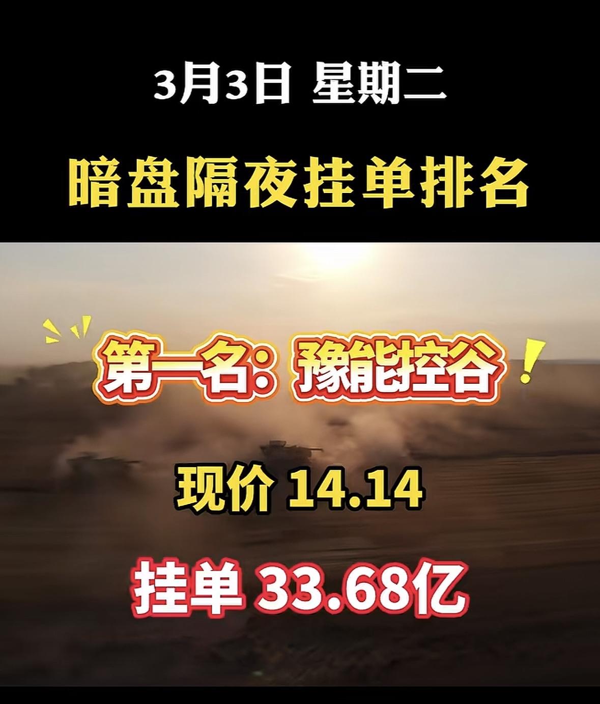 3月3日暗盘隔夜挂单排名第八! 豫能控暗盘挂单火爆,资金抢筹热情高涨,市场关注