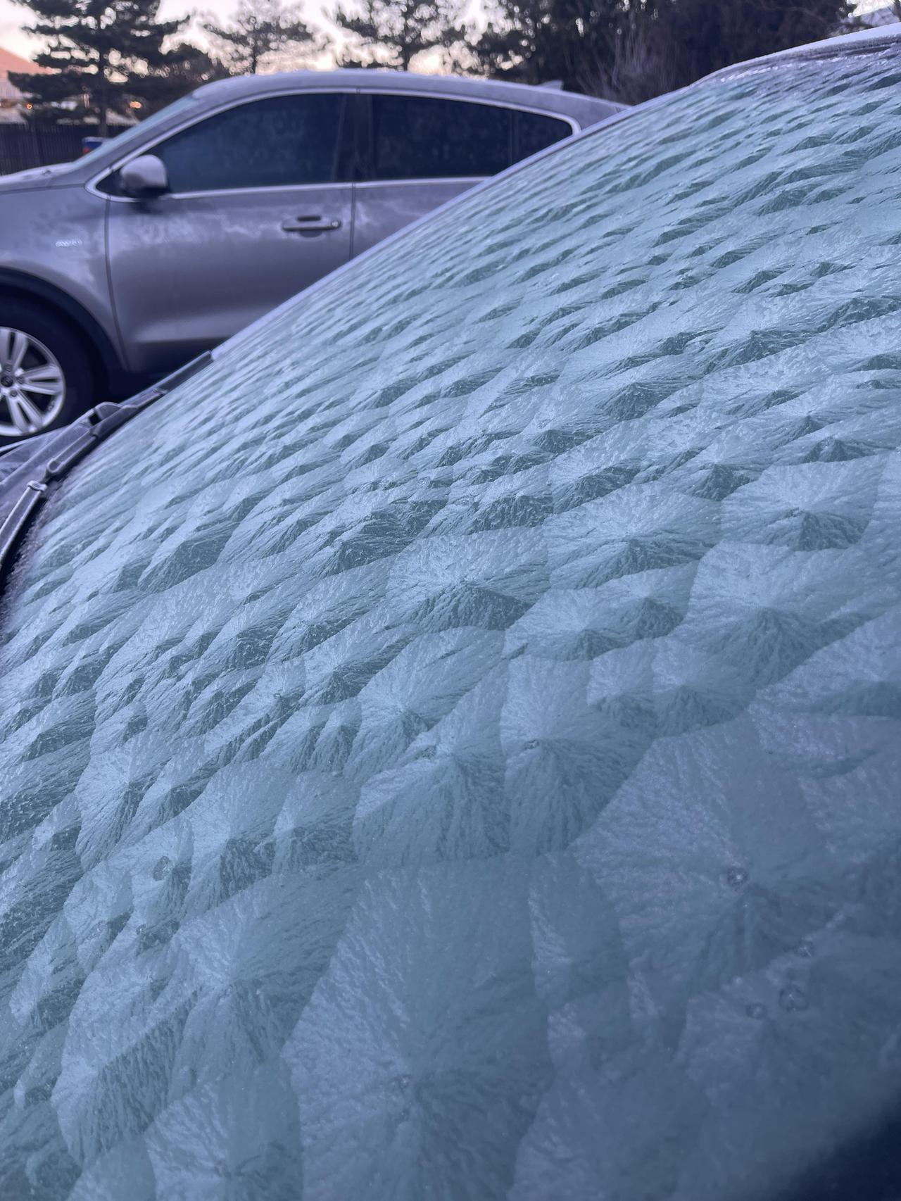 有人早上出门发现自己车的挡风玻璃上结了一层特别神奇的霜,不是普通的那种均匀薄霜,而是形成了一个个凸起的多边形图案,看起来像3D的立体几何纹理,整个玻璃表面就像铺满了一片片冰晶钻石,在阳光下特别好看。评论区有人指出这其实是沃罗诺伊图案,是一种数学上的几何分割结构,大自然自己就能生成。还有人说自己在北方冷地方长大这么多年从来没见过这种霜,也有人说这看着像任天堂64游戏机时代的低多边形画面。