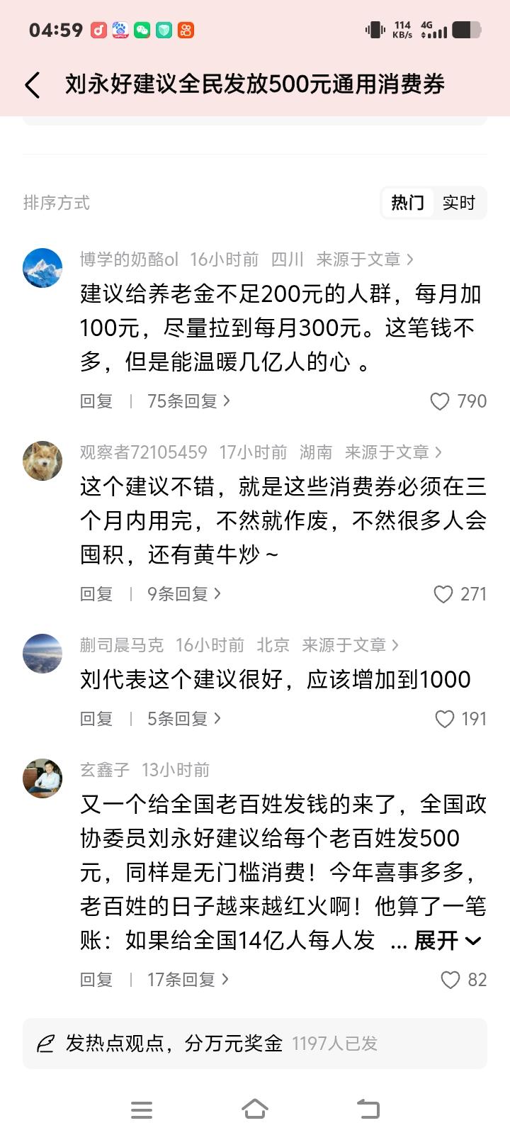 刘永好500元全民消费券引爆网络:这7000亿真能撬动2万亿内需?背后藏着普通人的生存密码! 当一位身家百亿的民营企业家,在两会上郑重建议给全国14亿人每人发500元,这早已超越了一个简单的经济提案。它像一块投入平静湖面的巨石,激起的不仅是消费的涟漪,更是无数普通人内心深处对“公平”与“获得感”最直接的呐喊。我们讨论的何止是钱,是一个信号,一种可能。 过去几年,我们见惯了各种消费券。它们往往戴着“满减”的镣铐跳舞,最终流向大宗家电、品牌连锁。街角那对起早贪黑的早餐摊夫妇,菜市场里守着几筐青菜的老农,他们似乎总是被遗忘在数据的角落。刘永好戳破的,正是这种“惠而不普”的尴尬。 这500元通用券的设想,妙就妙在它的“简单粗暴”。不设门槛,不分行业,就像一场普惠的春雨,力求洒到每一寸干涸的土地。它信任每一个身份证背后的个体,都有自主选择如何改善生活的智慧。这背后,是对市井烟火气最深的眷顾,是对经济毛细血管最直接的滋养。 有人算账,7000亿投入撬动2万亿消费,还能撑起千万就业岗位。这数字令人振奋,但更动人的是数字之外的画面:或许是一位母亲用这笔“意外之喜”给孩子添了件新衣,或许是一个家庭因此决定周末下顿馆子,又或许是小区门口的水果摊因此多做了几单生意。消费的暖流,正是由这些微小的幸福瞬间汇成。 当然,质疑声从未缺席。怕有人存起来不用,怕刺激效果短暂。但请看看那些高赞评论里,普通网友最朴素的呼唤:“发到农村手里才实在”、“别搞复杂抢券,直接发”。这些声音揭示了一个更本质的需求:人们渴望的,是一份不被区别对待的关怀,一种能握在手里的、实实在在的“暖意”。 从更深层看,这份提案之所以引发海量共鸣,是因为它触碰了时代情绪的脉搏。在经济增速换挡、不确定性犹存的当下,普通人太需要一点确定性的“甜头”来提振信心。这500元,符号意义远大于实际面额。它代表着“被看见”,代表着增长红利有途径“雨露均沾”。这份心理上的托举,有时比经济上的拉动更为珍贵。 富豪为全民“争利”,这本身就是一个值得品味的现象。它或许预示着,越来越多的有识之士认识到,经济的健康循环,离不开最广大基座人群的消费活力与生活底气。大河有水,小河才能满;万家灯火明亮,经济的巨轮才能行稳致远。 这场关于500元消费券的大讨论,最终会走向何方尚未可知。但它无疑完成了一次成功的全民经济启蒙,让我们共同思考:什么样的政策,才能最精准地抵达那些最需要温暖的手心?普惠的阳光,该如何才能真正照进生活的每一个缝隙? (来源:综合第一财经、财联社等媒体报道及网络热议) 消费券 普惠经济