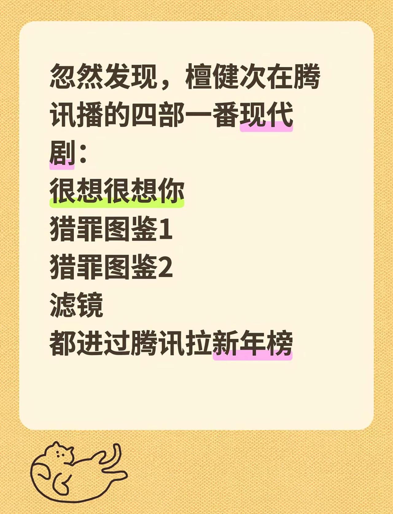 忽然发现,檀健次在腾讯播的四部一番现代剧:很想很想你猎罪图鉴1猎罪图鉴2滤镜都进过腾讯拉新年榜檀健次 何不同舟渡 谢却山 相柳
