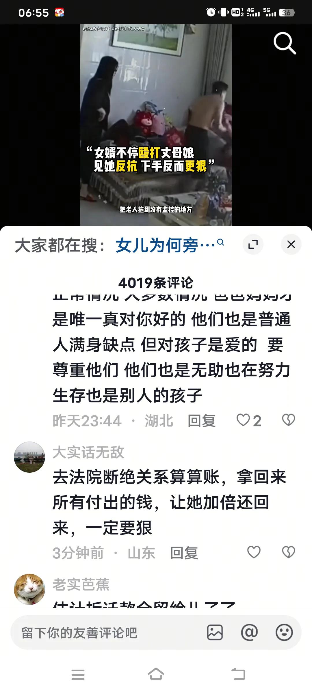 这样的女儿简直成白疼了。网友直呼,去法院断绝关系,拿回所有付出的钱,还让她加倍返还,一定要狠! 原因是她老公殴打她亲妈,女儿目睹全过程,竟无动于衷。丈母娘还手时,女婿不但不停手,反而打得更凶,最后还把丈母娘拖到没有监控的地方继续施暴。要说这做女儿的,即便不敢动手制止,也该报警啊!毕竟你是母亲十月怀胎生下的,怎能如此冷漠,袖手旁观呢!有网友说,亲女儿眼睁睁看着妈妈被打,简直没人性。 做妈妈的这下彻底心凉了!一把屎一把尿把女儿拉扯大,女儿却眼睁睁看着妈妈被打到住进医院,这还有啥盼头!必须让他们受到法律制裁,见者不救等同于合谋。 对女儿有寒心 母亲控诉 养废了的女儿