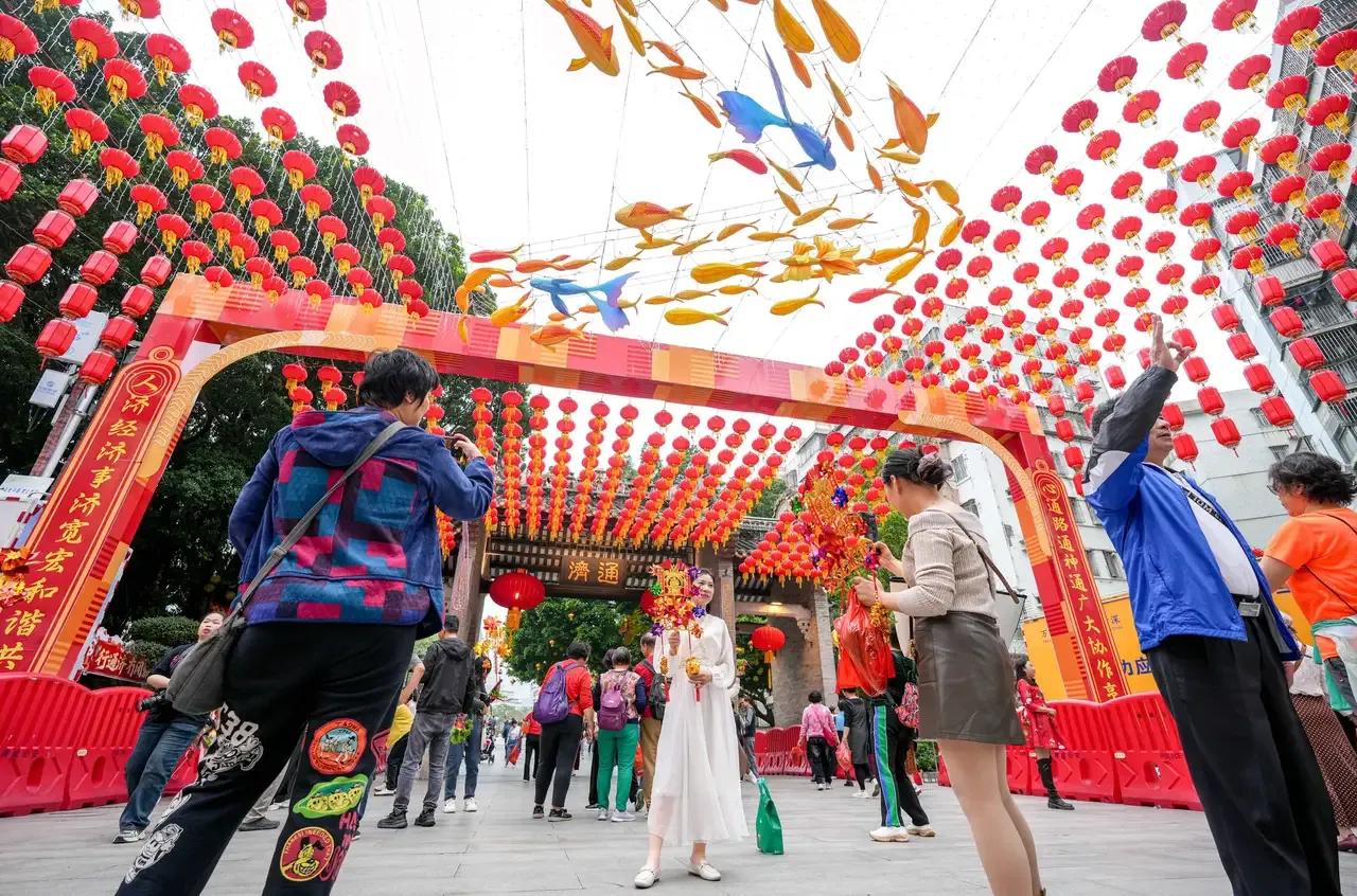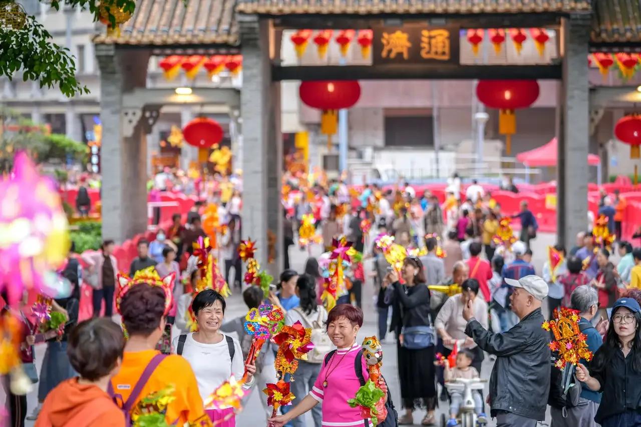 图集|元宵顶流来了,佛山行通济正式开启。 行通济,冇闭翳。今年佛山最热闹的元宵民俗,行通济已经拉开序幕。 3月2日,正月十四当天,就已经有大批市民和游客提前过来凑热闹。很多人手里举着风车,拎着生菜,一路笑着走过通济桥,就想借着这个传统习俗,给自己和家人求个平安顺利,求个新一年顺顺利利没烦恼。 现场的气氛特别足,还没到正日子,人就已经很多。大家一边走,一边拍照,桥边、牌坊下面到处都是合影的人。今年是马年,现场还能看到不少小马驹造型的装饰,成了大家眼里的小主角,很多人都会特意停下来看一看。 通济桥两边挂满了灯笼,远远看过去一片红火。路边摆满了卖风车和生菜的小摊,这两样是行通济的标配,几乎人人都会带上一份。风车转一转,寓意时来运转,生菜带着生财的好彩头,买上一份,就是把一整年的好兆头带回家。 桥上人来人往,大家脚步不快,脸上都带着轻松的笑。没有太多喧闹,就是安安稳稳地走一趟,把心里的期盼都放在这一趟行走里。 这一趟走下来,不只是赶个热闹,更是佛山人每年都要守的习惯。不管是本地人还是外来的游客,只要走上通济桥,就是图个心安,图个来年顺顺利利,平平安安。