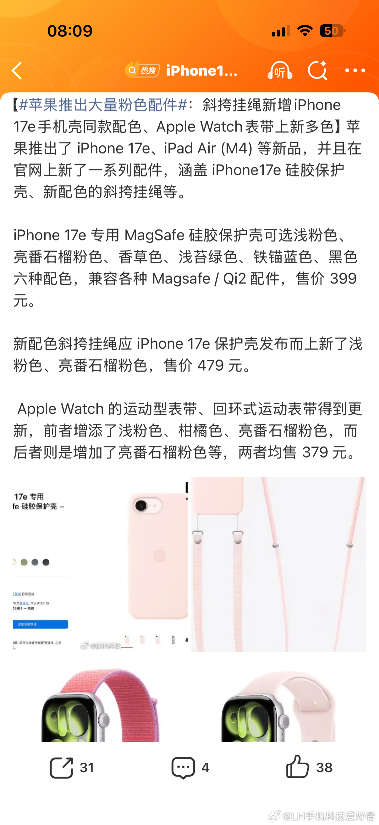 LH手机科技爱好者苹果推出大量粉色配件除了iPhone17e和新款iPad系列产品之外,苹果公司还推出了大量的粉色配件,比如手机壳和表带,这个颜色看上去还行。只不过,苹果的配件价格是真的贵,动不动就几百块以上。