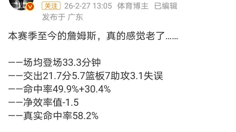 美媒:一旦詹姆斯成为完全自由球员,库里和追梦将全力招募他加盟勇士。 本赛季至今的詹姆斯真的感觉老了。数据上(图2),已经是新秀赛季以来的最低值,实际观感也在明显下滑,这赛季是真不服老不行了。 但是老将底薪的詹姆斯还是很吃香的。