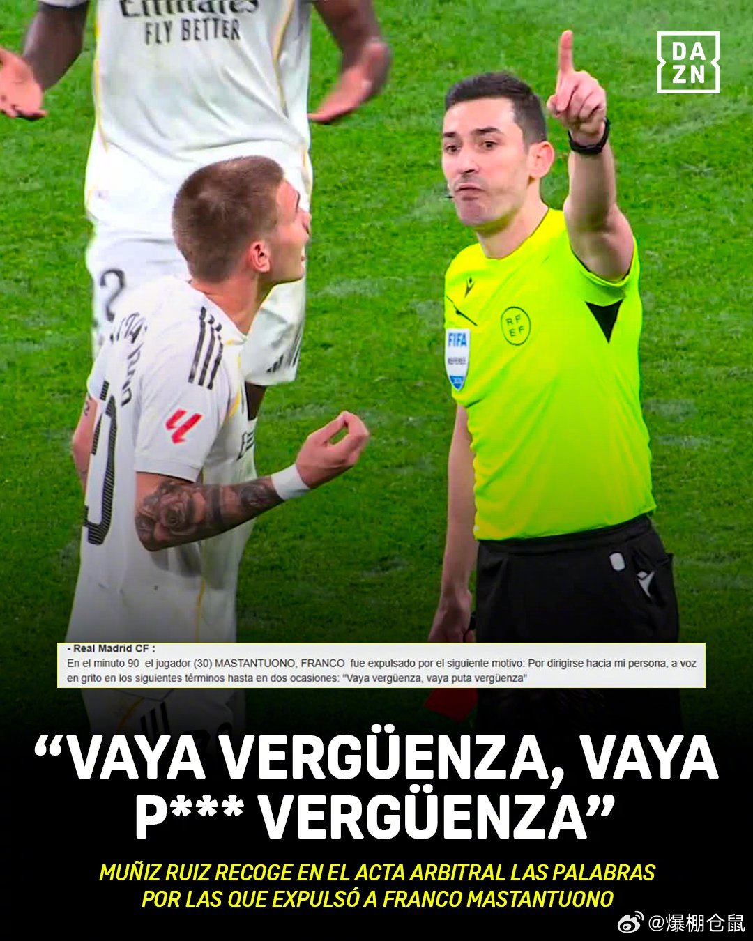 【直红罚出场】西班牙媒体:皇马0比1赫塔菲 ,皇马中场马斯坦托诺在比赛尾声时怒喷裁判:“真耻辱,真TM的耻辱!”他吃到职业生涯首个直红,也因此会被停赛2-3场。西甲