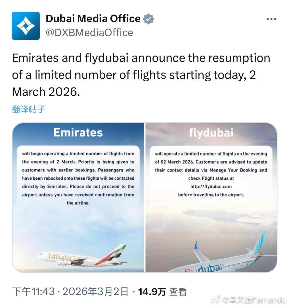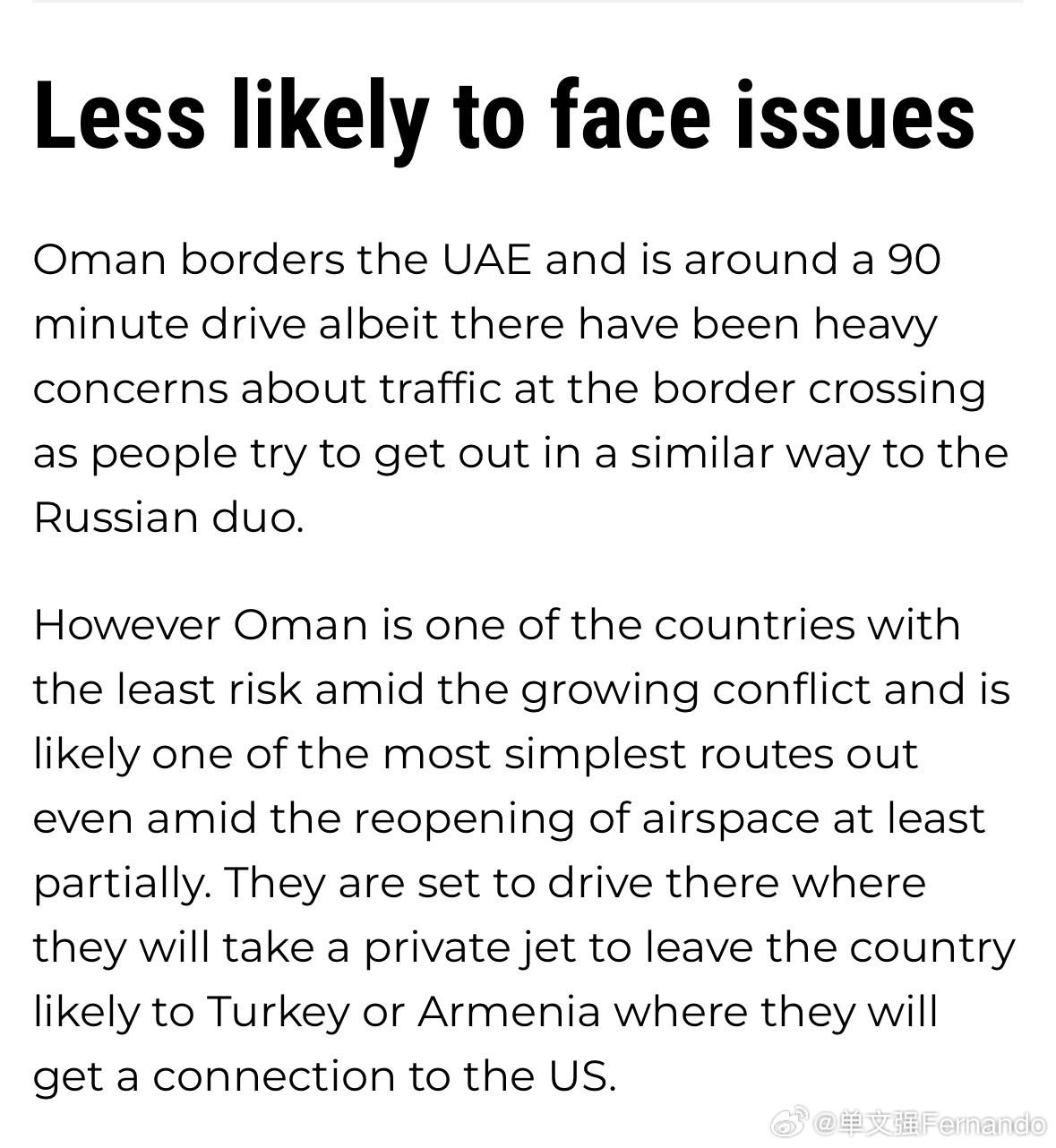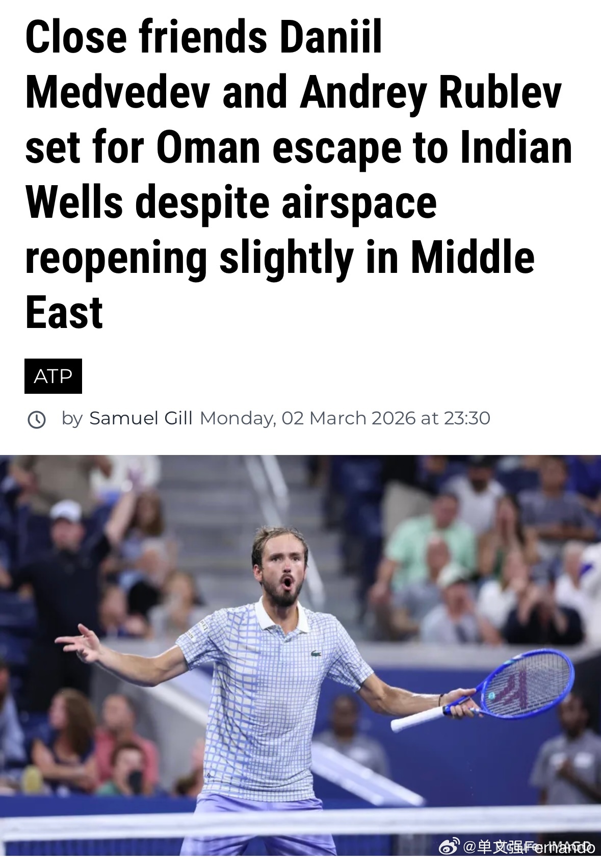 梅德韦杰夫和卢布列夫,计划了一条离开迪拜飞赴美国参加IW印第安维尔斯大师赛的路线:陆路开车从迪拜🇦🇪前往阿曼🇴🇲(可能需要5小时,因为有一大堆想从这条路跑的人,还需要准备通行证🪪)从阿曼🇴🇲搭乘私人飞机前往亚美尼亚🇦🇲or土耳其🇹🇷(安排一架私人飞机🛩️)亚美尼亚or土耳其搭乘正常飞机✈️美国洛杉矶,随后前往Palm Dessert棕榈泉抵达赛地!PS:目前迪拜机场情况有所好转,阿联酋航空Emirates和Flydubai都官方宣布有少量航班重新恢复运行!越来越多国家被卷入中东冲突