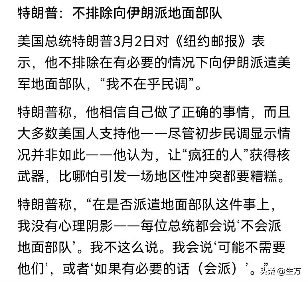 金灿荣:很多人就在等川普的这句话! 就是刚才,金灿荣教授引用了川普最新的表态,也是很多人期待的,到底他们要不要派地面部队去伊朗? 因为再见之前,美部长比较明确的表示,他们不会像以前阿富汗那样,派几十万大军过去搞几十年,结果什么结果都没有搞到,所以现在他们不会重蹈覆辙。 但是没想到他这个话说完不到两天,老头的意见就不一样了,根据老头裁缝的最新的这个回答来看,他会根据目前的形势,随时调整策略 ,因此到底会不会派地面部队,现在变得越来越说不清楚了。 之前有人说伊朗在下一盘大棋,就在等他们的地面部队去,要知道伊朗的国土面积非常大,而且山脉特别多,如果要真的打地面仗的话,那还真就不是几个月能够解决掉的问题。 但是目前打到今天为止,大家都是在空中打来打去,而且感觉目前伊朗在慢慢地发力了,根本就没有达到他的痛处,所以现在要看老头是怎么想的,就这样点到为止,还是真的想把人家打服,来个彻底的改头换面。 如果他想要第二种效果的话,那么在空中可能并不会彻底地解决问题,如果真的派地面部队的话,会想控制一样那么顺利吗,我们拭目以待。