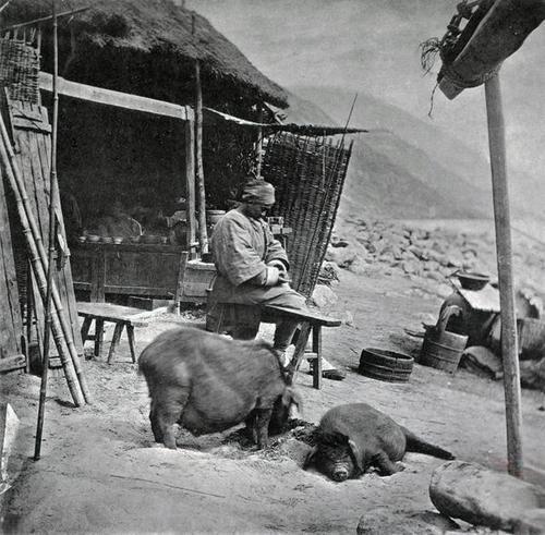 民国时期,南方山区一户普通农家,房屋是典型的干栏式草棚,以竹木为架,茅草覆顶,墙壁用竹篾编织而成,通风透气但简陋不堪,是南方山区常见的民居形式。 照片中坐在门口的老农,穿着厚实的棉衣,神态安详,最显眼的就是两头大肥猪,在当时的小农经济社会,猪是农家最重要的“活资产”和“移动储蓄罐”。那时的猪主要靠剩饭、泔水、猪草和野菜喂养,生长周期长,一头猪从仔猪养到出栏,往往需要一年甚至更久。这两头肥猪不仅是家庭一年辛勤劳作的成果,更是应对婚丧嫁娶、灾荒年景的重要经济保障,是衡量一户农家殷实程度的重要标志。