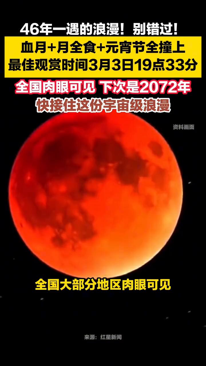 错过真要等46年,血月+月全食+元宵节。 真人主播AI播报。 46年一遇的浪漫,别错过。血月+月全食+元宵节全撞上。最佳观赏时间3月3日19点33分,全国肉眼可见,下次是2072年。快接住这份宇宙级浪漫。 3月3日,农历正月十五元宵节,夜空将上演一场壮观的月全食。一定要记好时间,19:04月亮会完全变红,全国大部分地区肉眼可见。这种巧合上一次在2007年,下一次就得2072年了。 快分享给你想一起看的人,一起许下好愿望。