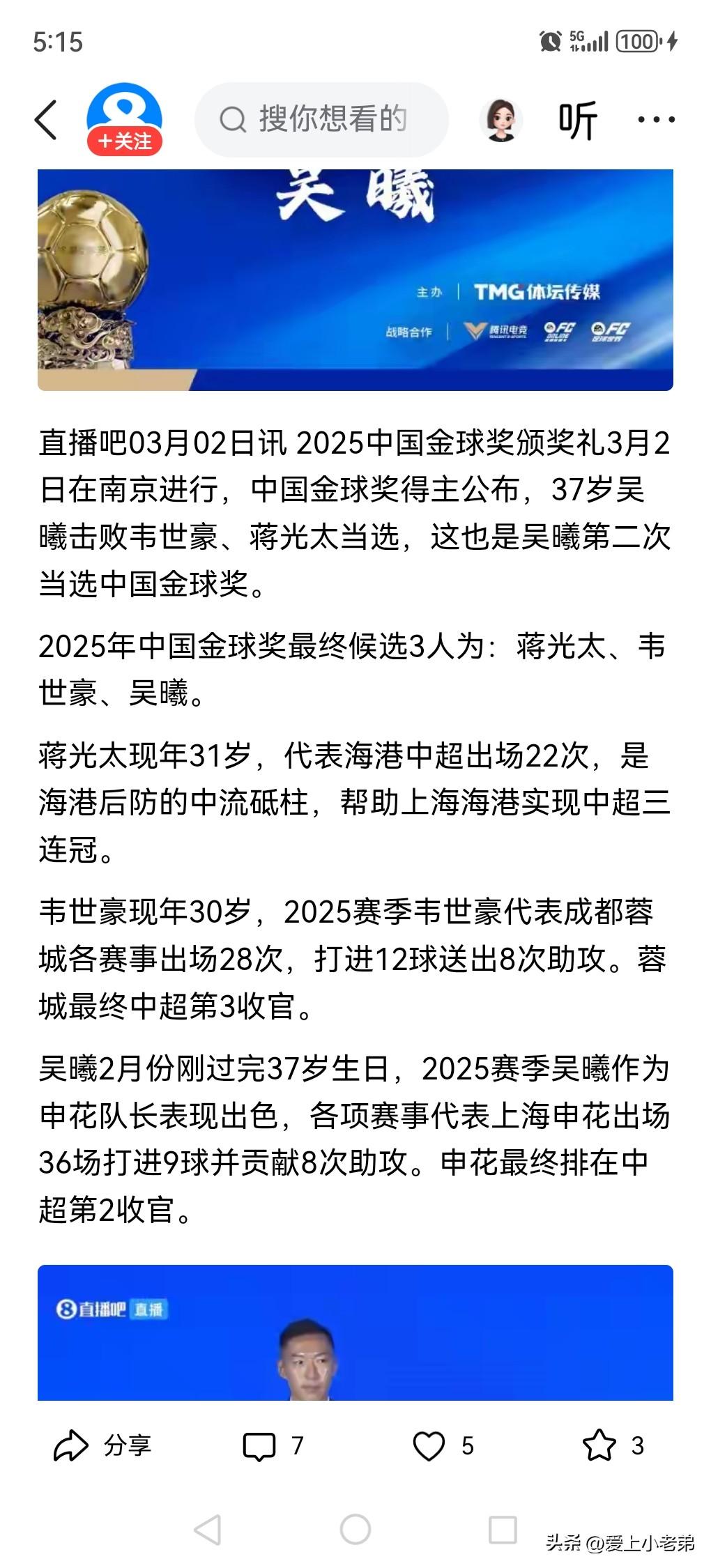 吴曦斩获金球奖乃实至名归,足协这事办得没毛病 近日,申花队长吴曦力压韦世豪和蒋光太荣誉25年金球奖。 37岁的老将能做到这点,确实不容易。 吴队当选可谓实至名归,想必不会有太多质疑声。 说实话,三位候选中蒋光太最吃亏,中卫拿金球的概率本就比不上进攻球员。 卡纳瓦罗拿过,可纵观历史有几个能跟他一样好运? 难道内斯塔、斯塔姆、马尔蒂尼就一定比他差? 后卫在评选中确实存在天然劣势,但这次输给吴曦没问题。 首先,蒋光太联赛出场率不及对手,几乎错过⅓的比赛。 其次,上赛季丢了44球,对于冠军球队而言有点多了。 最后也是最关键一点,蒋光太个人感觉是在走下坡路,速度和力量已过巅峰。 而吴曦则不同,至少上赛季完全没看出他已经36岁。 贡献9球5助生涯最佳数据外,28场首发几乎踢满全场,能进球能组织,谁敢信这是个老将? 不夸张地说,这种惊艳数据和表现让人盲猜,选26岁的肯定远大于36岁。 吴曦的表现确实太不科学,就凭这点胜过蒋光太一点没毛病。 至于韦世豪,确实数据也很漂亮,12球8助是成都蓉城拿季军的重要拼图。 光论终结能力,韦世豪显然更胜一筹,但足球远不止这些。 两人差距在于,韦世豪仅是球队重要攻击手,而吴队是精神领袖和核心。 8号位的吴曦距离球门更远,集进攻、组织和防守于一体,场上属性的丰富程度远高于韦世豪。 通俗点说,吴曦的运筹帷幄能为球队创造出更多得分机会。 通过控制节奏和调度皮球,让攻击手体现出存在的价值。 显然韦世豪无法承担攻防节拍器的角色。 打个比方,韦世豪是冲锋陷阵的大将,而吴曦是坐镇中军的统帅。 孰高孰低,一目了然。 所以,韦世豪输得也该服气,不是他不够优秀,而是强中更有强中手。 此后他在社交媒体发布的短视频,多少显得有些小家子气。 作为申花球迷,能拥有吴曦这样的球员实在是一件幸事。 既有实力又是榜样,当年朱骏要是没把他送走,那该多好。 最好的年纪没能在申花,造化弄人。 对球迷而言,如今也是看一场少一场,不知吴队还能坚持多久。 真心希望能在退役之前为球队拿一个联赛冠军,球员生涯不留遗憾。 总结一下,吴曦老骥伏枥,评选没问题。