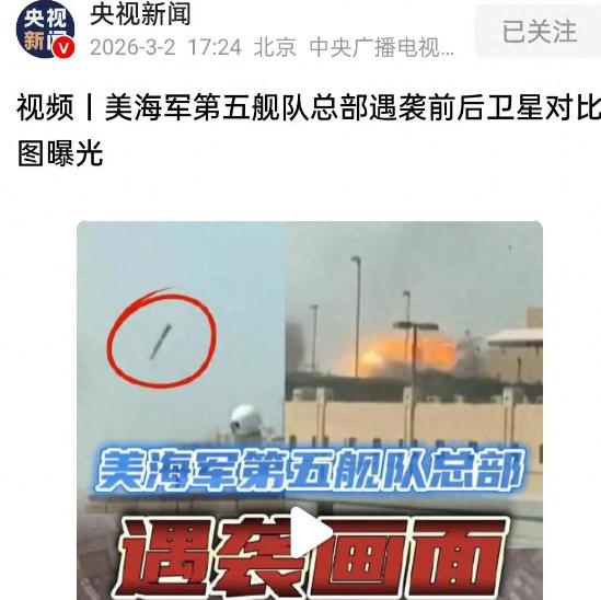 厉害了,伊朗炸掉了美国第五舰队总部!怎么做到的? 央视新闻、路透社等多家权威媒体 3 月 2 日曝光卫星对比图,证实 2026 年 2 月 28 日至 3 月 1 日,伊朗对巴林麦纳麦的美海军第五舰队总部发起多轮导弹打击,不仅炸掉价值五六亿美元的卫星终端,还引燃基地油库、瘫痪核心设施,让美军在中东经营三十年的 “铁堡垒” 瞬间破防。 这座被美军视为中东海上力量 “心脏” 的基地,1995 年重新组建后便成为区域战略核心。它管辖着波斯湾、红海等 400 万平方公里关键水域,常年部署约 1.5 万名美军官兵,更是霍尔木兹海峡原油运输通道的护航中枢。如此重要的军事枢纽遭遇重创,绝非偶然因素促成。 伊朗此次打击专门选用改进型 “法塔赫 - 1400” 弹道导弹,搭配小型电磁干扰弹构建复合打击体系。这款导弹延续了 “法塔赫” 系列的固体燃料优势,发射准备时间大幅缩短,依托公路机动发射车实现快速部署。电磁干扰弹率先作用于基地防空雷达,直接瘫痪美军宙斯盾系统的探测能力,为后续导弹突防扫清障碍。 伊朗的导弹库存规模成为持续打击的核心支撑。公开数据显示,伊朗各类型导弹储备量达到 6000 至 10000 枚,近几年更完成 800 至 1000 枚导弹的翻新升级。这些导弹覆盖近程战术打击到中程战略威慑全范围,其中 “法塔赫 - 110D” 射程精准覆盖巴林,命中精度控制在 5 米级别,足以锁定卫星终端、油库等核心目标。 战术协同设计让打击效果倍增。伊朗没有单一发动导弹打击,而是同步协调胡塞武装、伊拉克民兵等力量从多方向发起牵制。2 月 28 日深夜首轮打击集中摧毁通信塔与预警雷达,让基地与舰队的指挥链路彻底中断。紧接着,第二轮导弹精准命中地下燃料罐集群,引发的连环大火持续燃烧至 3 月 1 日中午,焚毁泄漏燃油达 78.6 万吨。 美军自身的防御漏洞加速了基地破防。为强化卡塔尔等重点区域防御,美军此前撤走了巴林附近的导弹防御舰,导致第五舰队总部防空体系出现空缺。美军长期依赖固定设施构建威慑,却忽视了雷达站、油库等目标坐标固定的致命缺陷,在伊朗高精度导弹面前完全暴露。 更关键的是美军对伊朗实力的严重误判。美以联合发起首轮打击后,错误认为伊朗政权已陷入脆弱状态,低估了其导弹技术的成熟度。伊朗通过弹道导弹高空高速突防与巡航导弹低空渗透的组合模式,让美军防御系统难以兼顾。卡塔尔乌代德空军基地造价 11.2 亿美元的 “铺路爪” 雷达,也在这种协同战术下被彻底摧毁。 这场打击的连锁反应正在持续扩散。波斯湾内的美军战舰因燃油耗尽陷入续航困境,航母被迫停驻原地丧失制海权优势。巴林、科威特等国出现平民伤亡,各国纷纷关闭领空、疏散民众,民生秩序受到严重冲击。国际油价应声上涨,布伦特原油一度涨超 13%,全球能源市场陷入震荡。 伊朗最高国家安全委员会秘书拉里贾尼已明确表态,伊朗无意攻击地区国家,但会坚决反击利用本土基地针对伊朗的势力。联合国安理会已召开紧急会议,秘书长古特雷斯呼吁各方立即停火,通过对话化解分歧。 美军在中东经营三十年的军事布局遭遇实质性冲击。固定基地从威慑利器沦为攻击目标,后勤补给线被严重切断,立体防空圈出现致命漏洞。这场冲突彻底打破了 “基地即力量” 的旧格局,证明远程精确打击时代,战术灵活性与技术自主性才是核心竞争力。 如今波斯湾的硝烟仍未散去,伊朗的 “真实承诺 - 4” 反击行动还在持续。美以的报复性计划与伊朗的强硬姿态形成对峙,整个中东已成为牵动全球的战略焦点。这场由军事误判引发的连锁反应,终将让各方认清战争没有赢家的现实。