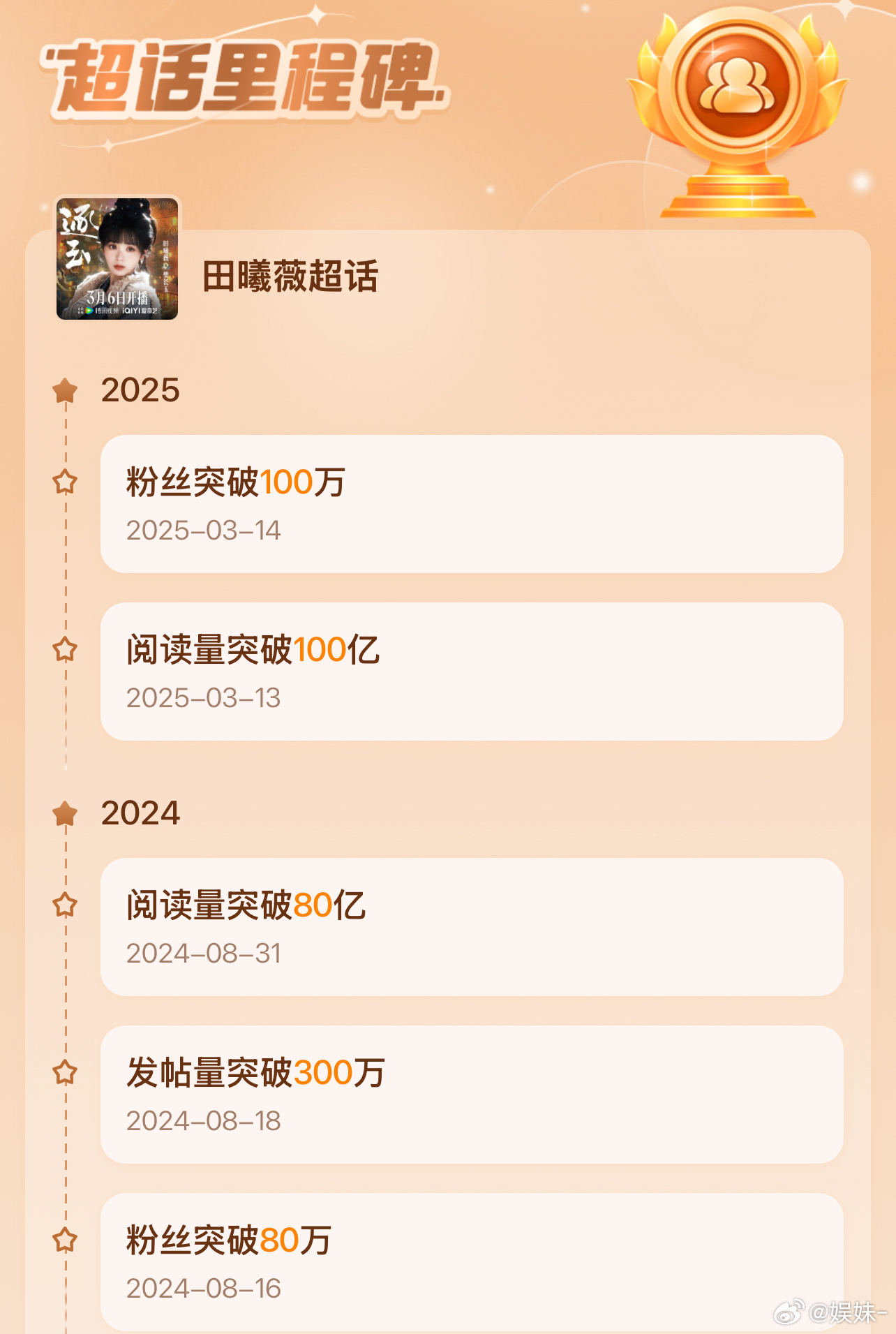 我最开始关注田曦薇的时候,她的超话只有2w粉丝,真好啊现在都有一百多万了