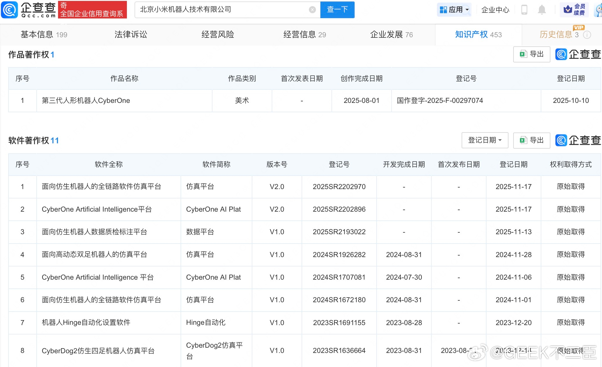 小米三代人形机器人已登记著作权据报道,近日,小米公布了人形机器人在汽车工厂自主作业的视频,其已经能够连续工作3个小时。企查查APP显示,去年10月,北京小米机器人技术有限公司登记“第三代人形机器人CyberOne”作品著作权,作品类别为美术。此外,该公司还拥有“面向仿生机器人的全链路软件仿真平台”“面向仿生机器人数据质检标注平台”“CyberDog2仿生四足机器人仿真平台”软件著作权。