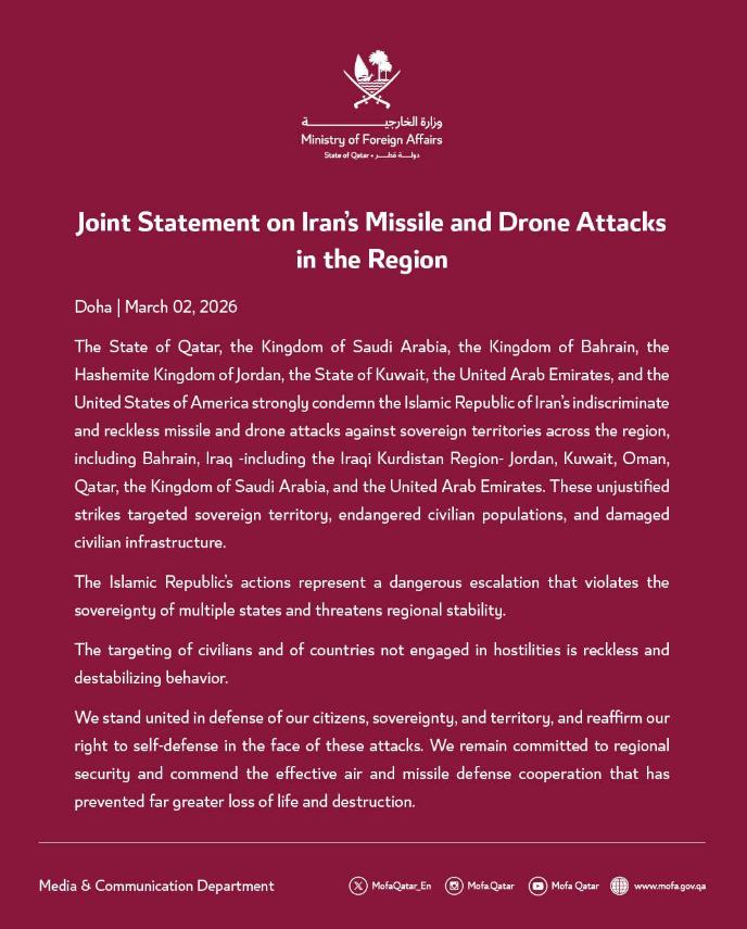 3 月 3 日,美国以色列和伊朗的冲突发生至今,让外界最意外,对中国冲击也最大的一个变化,就是海湾阿拉伯国家与伊朗关系的快速恶化。今天海湾国家再次发布了针对伊朗的联合谴责声明。那么这个声明说了一些什么?未来海湾国家与伊朗的军事对抗会进一步升级吗? 这份声明是海湾阿拉伯国家合作委员会6国外长,在3月1日紧急视频会议后再次补充发布的,核心内容其实很明确。 首先,声明里强烈谴责了伊朗近期对海湾国家发动的导弹和无人机袭击,明确说这种行为严重侵犯了海湾国家的主权,也威胁到了地区的安全和稳定。 声明里强调了一点:海湾国家的安全是不可分割的,对任何一个成员国的攻击,都相当于对所有成员国的攻击。 这相当于把6个国家绑在了一起,形成了一个统一的战线,同时也明确表示,他们会保留根据《联合国宪章》第五十一条,对伊朗的侵略行为作出回应的合法权利,简单说就是“你敢再打,我们就敢反击”。 除此之外,声明里还提到了一个很重要的点,就是海湾地区的稳定不仅是地区性问题,更是全球经济稳定的根本支柱,毕竟这里是全球能源的核心产区,所以要求伊朗立即停止所有袭击,通过对话和外交手段解决问题,恢复地区的和平与稳定。 看得出来,海湾国家一边在强硬表态,一边也没完全堵死谈判的大门,算是留了一丝缓冲的空间。 可能有人会问,之前海湾国家不是还在试图调解美伊矛盾吗?怎么突然就和伊朗彻底撕破脸了?其实这背后全是被逼出来的无奈。 自从2月28日美以联合对伊朗发动军事打击,伊朗展开报复以来,海湾国家就被硬生生卷了进来,成了无辜的受害者。 根据环球网的报道,这几天伊朗的导弹和无人机,已经波及到了卡塔尔、沙特、阿联酋、科威特等多个海湾国家,甚至连一直扮演调解者角色的阿曼都没能幸免。 卡塔尔的天然气处理设施被无人机袭击,不得不暂停液化天然气生产;沙特阿美公司的炼油厂遭袭引发火情,沙特方面已经放话,如果伊朗发动协同攻击,他们也会打击伊朗的石油设施;阿联酋更是遭到了几百架无人机的袭击,虽然大部分被拦截,但也让当地民众陷入了恐慌,迪拜的主要道路车流量骤减,政府甚至要求私营部门居家办公。 伊朗方面也有自己的说法,伊朗外长阿拉格齐在接受半岛电视台采访时表示,伊朗无意攻击邻国,他们的目标是驻扎在这些国家的美国军事存在,这场战争是美国和以色列强加给伊朗的。 甚至连阿曼遇袭,伊朗都解释说,是军队按照预先指令行动,并非政府本意,还说已经要求武装部队谨慎选择目标。 但不管伊朗怎么解释,海湾国家的怒火已经被点燃了,要知道,海湾国家的经济命脉全靠能源设施和旅游业,而这些设施偏偏非常脆弱,纽约大学阿布扎比分校的教授就说过,海湾国家地处酷热干燥地区,没有海水淡化厂和电力网就难以居住,没有能源设施就没有收入来源。伊朗的袭击,相当于直接掐住了他们的命门,换谁都不能忍。 接下来就是大家最关心的问题:未来海湾国家和伊朗的军事对抗,会进一步升级吗?短期内会持续紧张,双方会不断秀肌肉、放狠话,但爆发全面军事对抗的可能性不大。 可能还有很多人关心,为什么说这种变化对中国冲击最大?其实很简单,中国是全球最大的石油进口国,每天都要通过霍尔木兹海峡进口大量原油,而霍尔木兹海峡就在海湾地区,一旦这里的冲突升级,海峡被封锁,国际油价必然暴涨,会直接影响到我们的能源安全和经济稳定。而且中国和海湾国家、伊朗都有着密切的经贸合作,双方关系恶化,也会影响到我们的合作布局。 总的来说,海湾国家和伊朗的关系,现在已经走到了一个关键的十字路口。短期内,双方的紧张局势还会持续,谴责、威慑会成为常态,但只要没有出现极端情况——比如伊朗袭击海湾国家的关键设施造成大规模伤亡,或者海湾国家主动发起报复性进攻,全面军事对抗就不会发生。 毕竟对双方来说,战争没有赢家,只有通过对话和谈判,找到彼此都能接受的平衡点,才能真正恢复地区的和平与稳定。而对我们来说,也只能持续关注局势的发展,希望双方都能保持克制,避免冲突进一步升级。