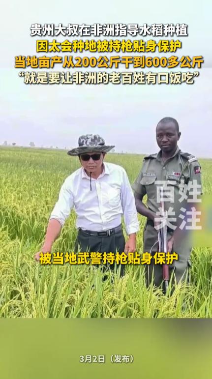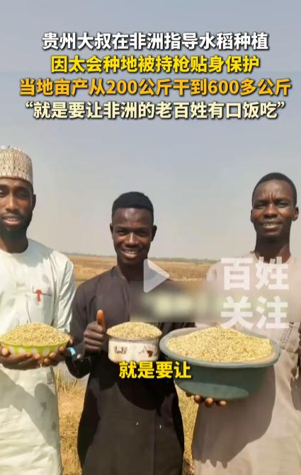 这哪是种地啊,简直是现实版爽文。贵州大叔因太会种地,政府派武警 24 小时持枪护着,配专车翻译,这待遇比明星还牛。一个普通农民,2017 年跑去尼日利亚,把水稻亩产从 200 公斤干到 650 公斤,翻了三倍多,当地人喊他 “金种子” 专家。 说实话,我挺佩服的。40℃高温下泡在泥田里,自学当地话沟通,硬是把荒地变粮仓。粮食安全就是命脉,他帮尼日利亚人吃饱饭,还培养本土骨干,中非友谊就这么种出来的。 网友狂赞 “太长脸了”,我也觉得。技术才是硬通货,一把锄头改写命运,比啥都实在。