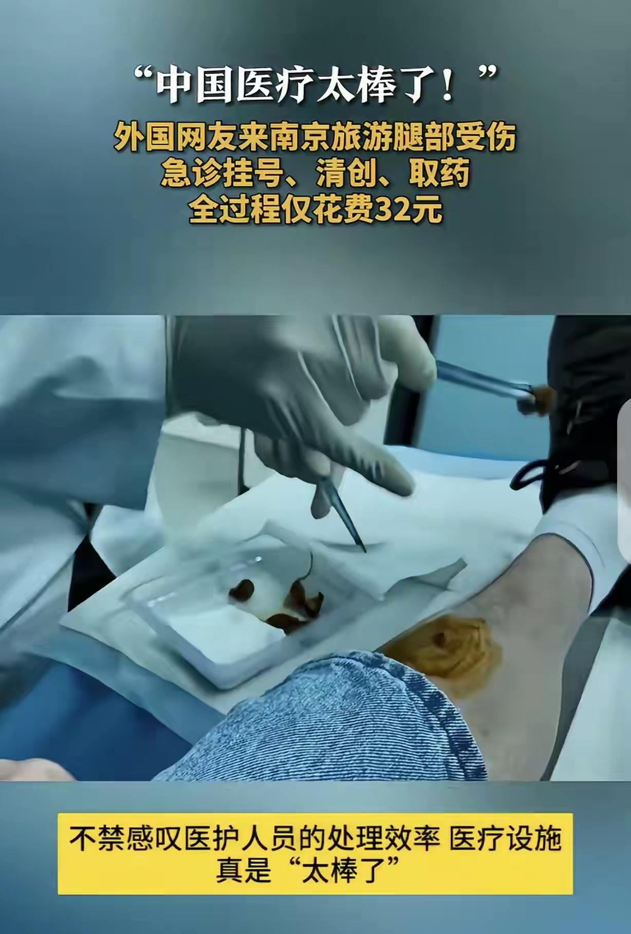 老外游玩时腿部受伤治疗仅要32元,盛赞中国人太友善了,办事效率太高了 一名外国人在南京游玩时不小心把腿磕伤,挂了急诊,医院紧急给予创伤救治并开了药,全程费用仅需32元,事后老外盛赞中国医院办事效率及看病非常便宜,声称中国人太友善了。 很多人有疑问?门诊挂号费多少钱?开药多少钱?伤口处理多少钱?破伤风打没打?受伤部位有没有拍片子?